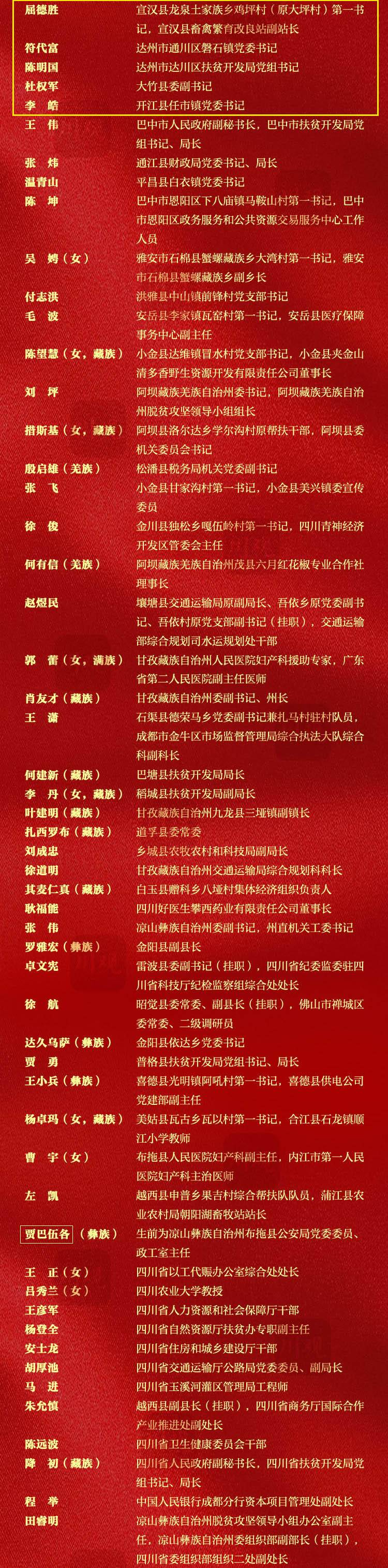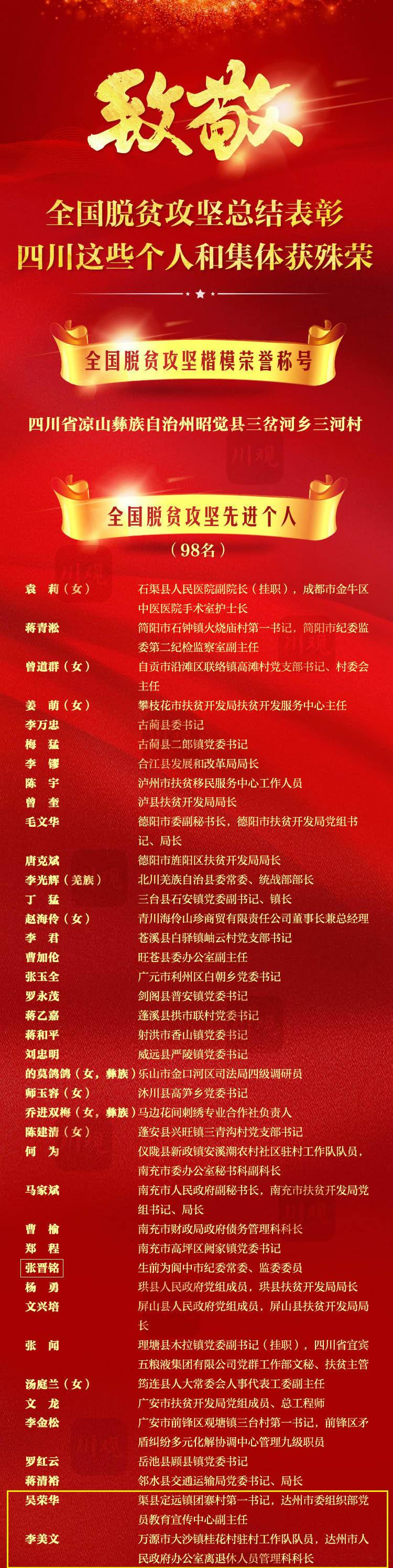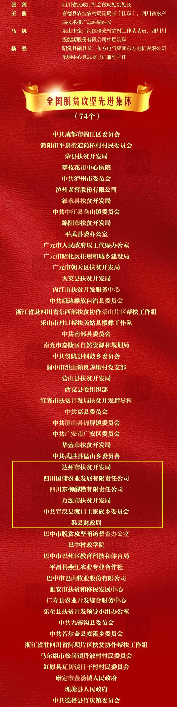2月25日,全国脱贫攻坚总结表彰大会在北京隆重举行。大会表彰1982名全国脱贫攻坚先进个人,以及1501个全国脱贫攻坚先进集体。四川共有98名个人、74个集体上榜,其中达州7人6集体受表彰。