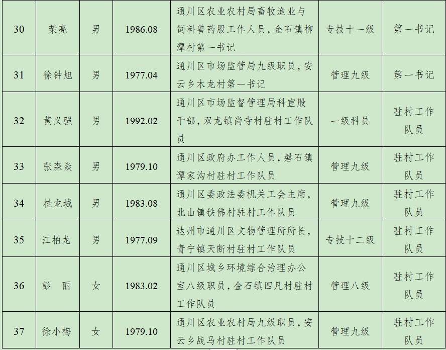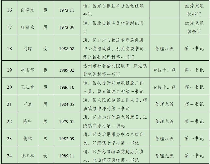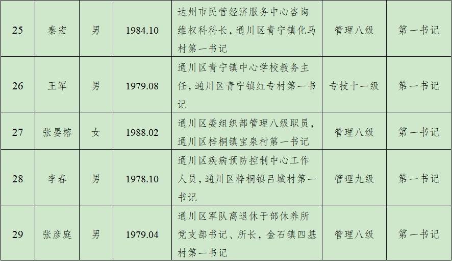 根据《中共达州市委组织部关于2021年从乡镇事业编制人员、优秀村党组织书记、到村任职过的选调生、第一书记、驻村工作队员中选拔拟任乡镇领导班子成员的公告》精神,现对“五方面人员”资格审查合格人员名单进行公示(其中:乡镇事业编制人员14名、优秀村党组织书记3名、第一书记14名、驻村工作队队员6名)。如对有关人选有不同意见,对其执行党风廉政建设责任制及廉洁从政情况有需要反映的问题,或发现其有违纪违规行为,请于2021年4月26日前以电话、信函、来访等方式向资格审查组反映或举报。反映问题要实事求是,电话和信函应告知真实姓名。欢迎对资格审查工作提出意见和建议。