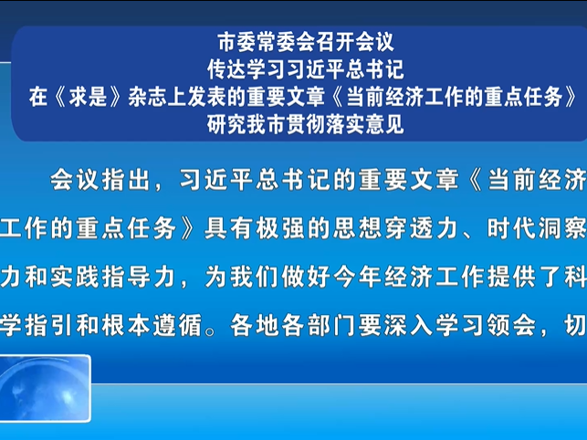 市委常委会召开会议 传达学习习近平总书记在《求是》杂志上发表的重要文章《当前经济工作的重点任务》 研究我市贯彻落实意见