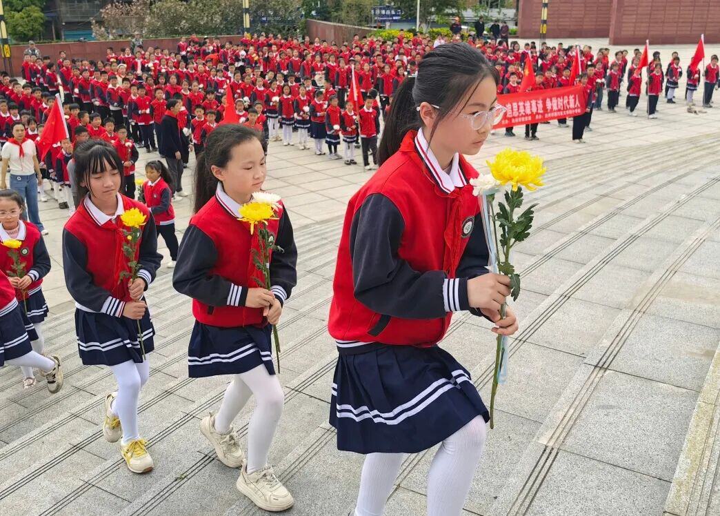 同学们身着整齐的校服,佩戴鲜艳的红领巾,手持洁白的菊花,怀着崇敬而肃穆的心情,排着整齐的队伍徒步前往烈士陵园。
