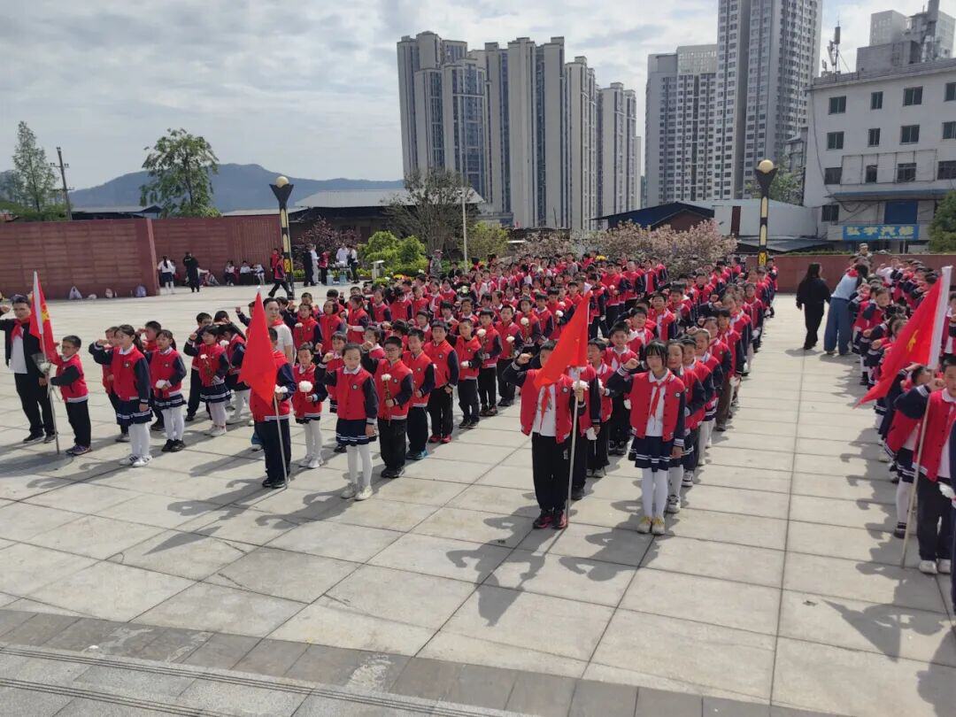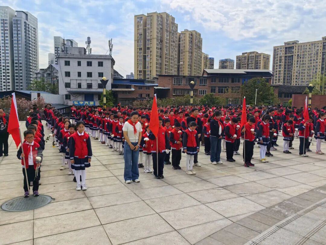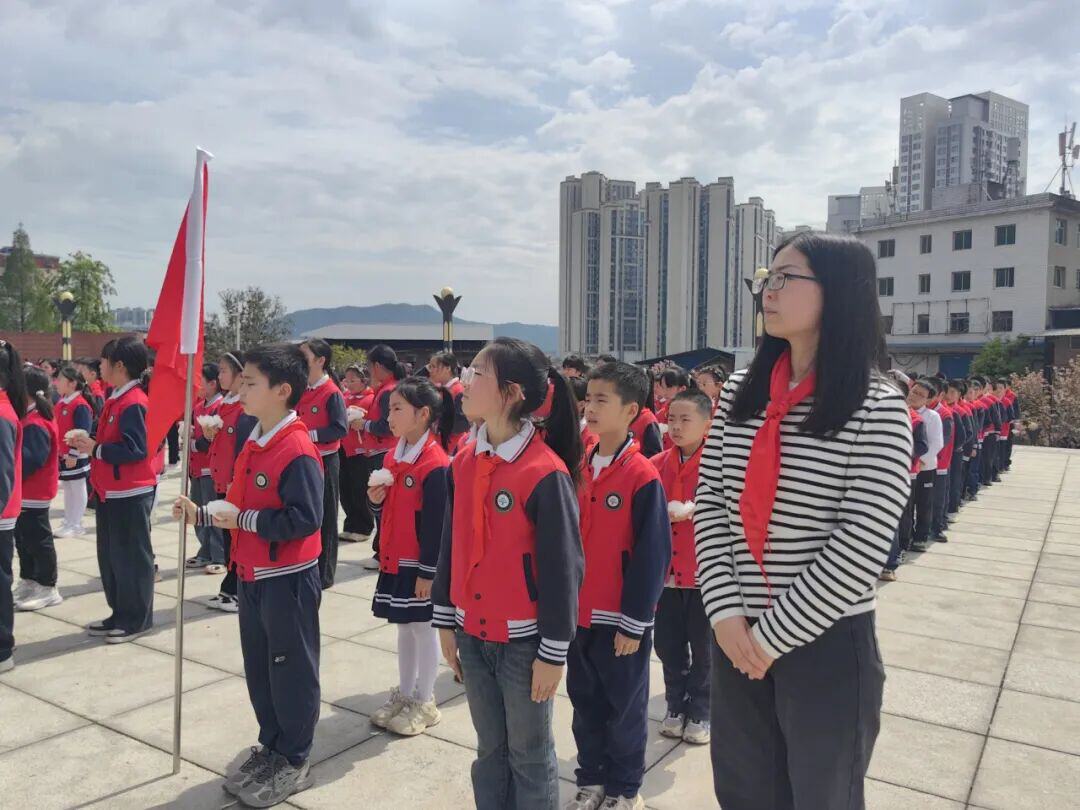 大队辅导员胡德领呼,全体队员齐声应和:“准备着,为共产主义事业而奋斗!”“时刻准备着!”响亮的呼号振奋人心,尽显文华少年的责任担当与青春气象。
