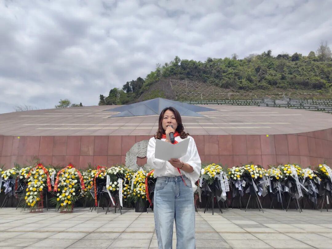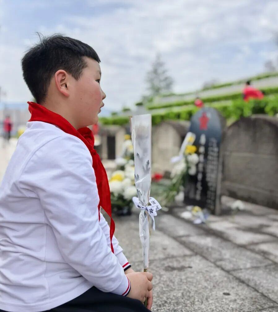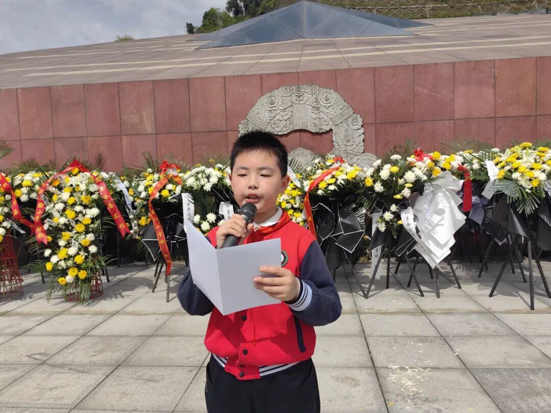 少先队员代表、四(4)中队王浩丞同学动情发言:“站在英烈长眠的土地上,我们仿佛听见战火轰鸣,看见先辈们浴血前行的身影。我们必将追寻你们的足迹,珍惜光阴、刻苦学习,让胸前的红领巾更加鲜艳夺目!”