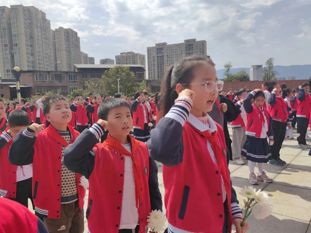在大队长的带领下,全体少先队员高举右拳,庄严重温入队誓词。铮铮誓言,字字千钧,响彻陵园。