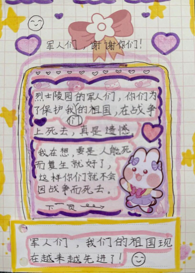 仪式尾声,师生们有序走近烈士纪念碑,细细瞻仰、静静追思。同学们将亲手制作的小白花与缅怀卡轻轻安放于碑前,以最纯粹的方式,向英烈诉说心声。一张张缅怀卡上,写满稚嫩而真挚的话语。一笔一画,皆是少年初心;一字一句,皆为薪火承诺。