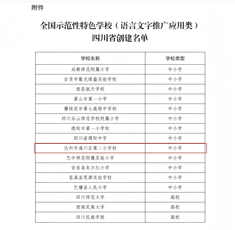 教育是强国建设、民族复兴之基。近日,教育部语用司公布全国示范性特色学校(语言文字推广应用类)创建名单,通川区第二小学校历经四级遴选成功入选,成为达州市唯一入选学校。此次全国仅300所、四川省仅16所学校上榜,这份荣誉既是通川二小的荣光,也是通川区坚守立德树人根本任务、深耕语言文字教育,推动教育高质量发展的有力见证。