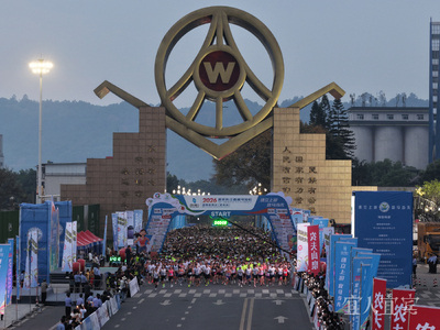 2026宜宾长江首城马拉松暨“跑遍四川”(宜宾站)在五粮液旗标广场鸣笛起跑(宜宾融媒 兰锋 摄)