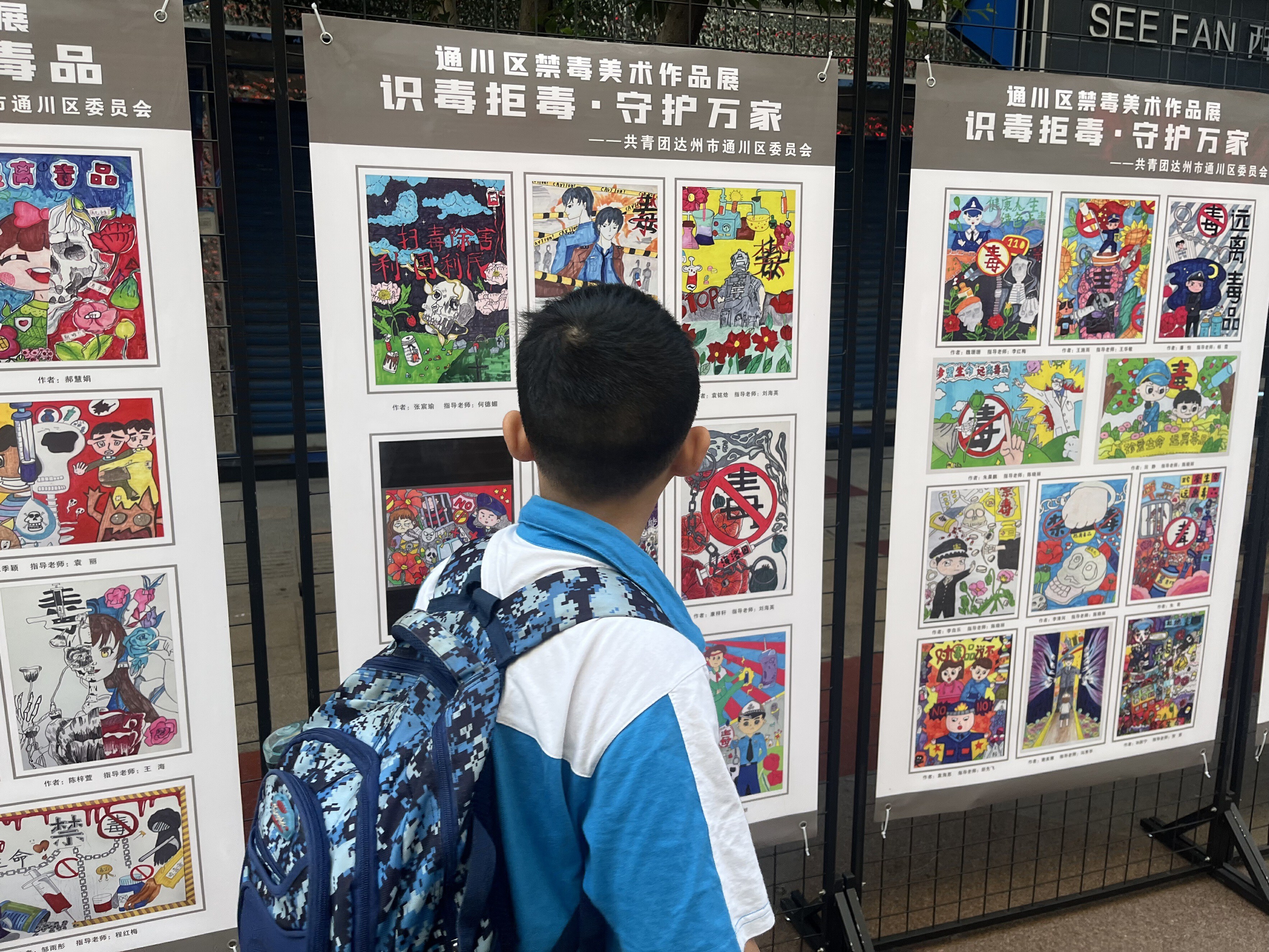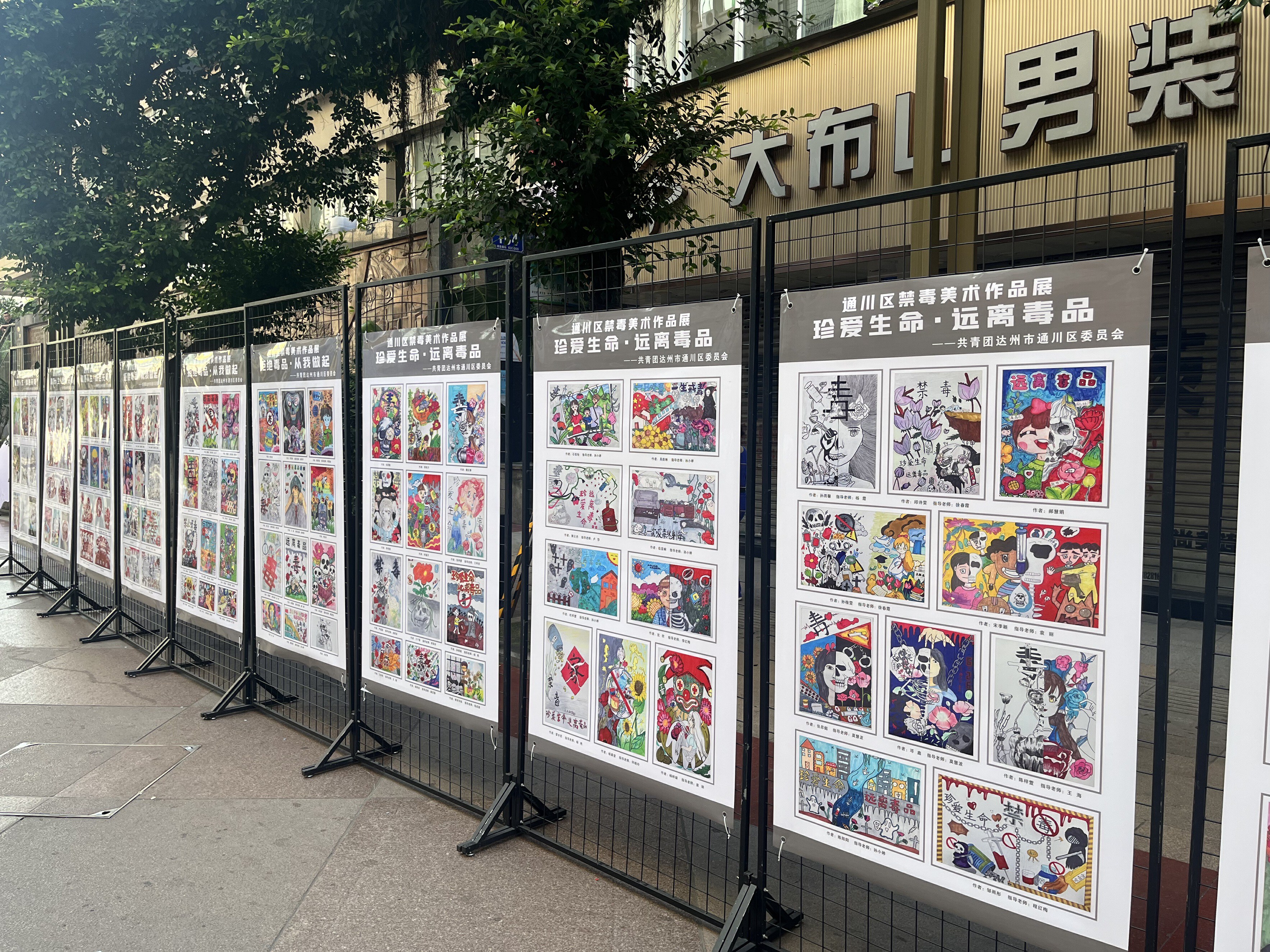 互动宣讲有声有色,作品展览如火如荼。通川区禁毒美术作品展前,来自全区中小学校的100余幅禁毒美术作品吸引着在场群众驻足观看。一幅幅主题鲜明、寓意丰富的画作,从毒品危害、健康生活、守护万家等多个角度,生动展现出通川青年的禁毒情怀,彰显着通川青年与毒划界、与毒斗争的决心,引发了现场群众的强烈共鸣。