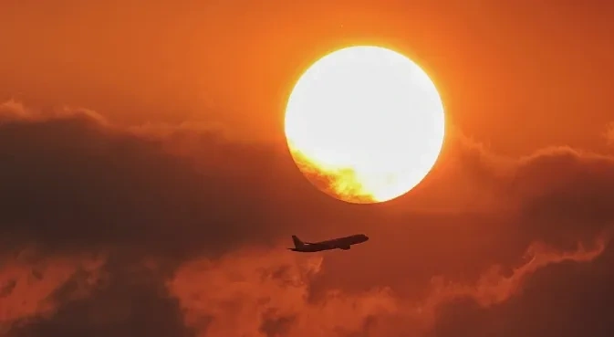 高温橙色预警下的成都生活,一架飞机从落日前飞过 摄影/C视觉 华小峰