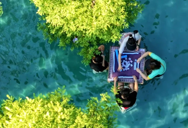 8月13日,游客在成都市双流区黄龙溪镇打“水上麻将”娱乐享清凉 摄影/C视觉 李向雨