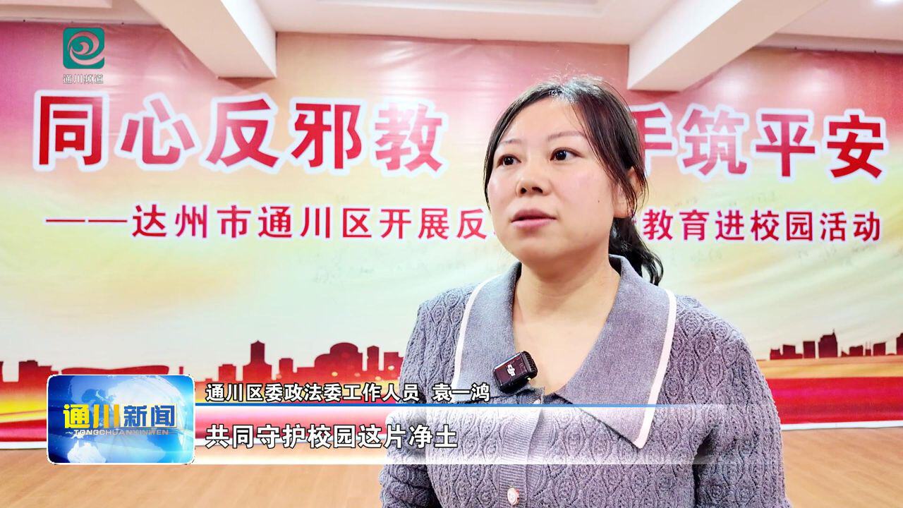 通川区委政法委工作人员 袁一鸿:通过今天的活动,增强了广大教职工的反邪教意识和能力,营造了识邪、防邪、拒邪、反邪的良好社会氛围。接下来,通川区委政法委将持续推动深化校地协作,支持全区各级各类学校常态化地开展反邪教宣传工作,将反邪教教育融入日常教学和管理,帮助学生扣好“人生的第一粒扣子”,共同守护校园这片净土。