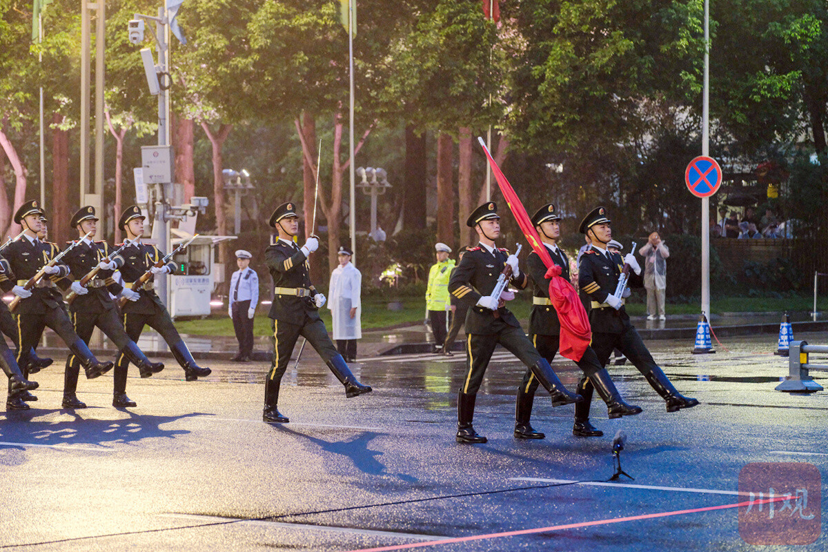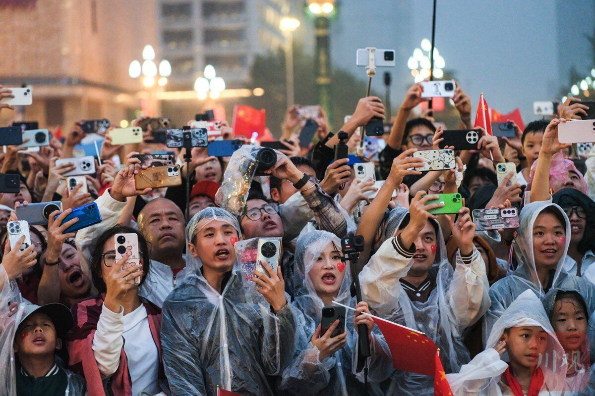 10月1日清晨,天空下起了小雨,但成都天府广场却洋溢着热烈的节日氛围,数万名市民和游客齐聚,冒雨观看升国旗仪式,庆祝新中国成立76周年。