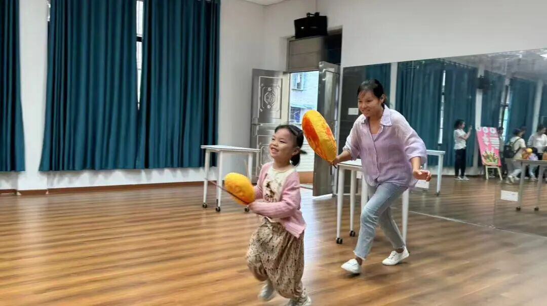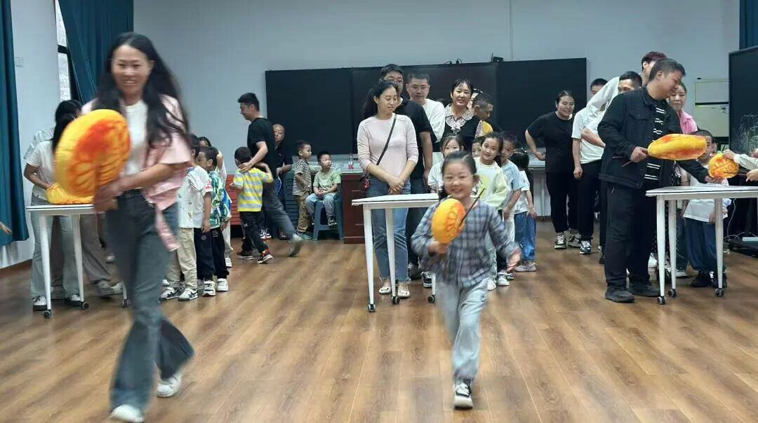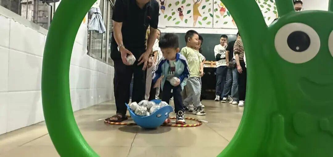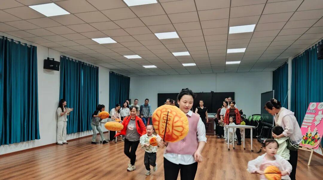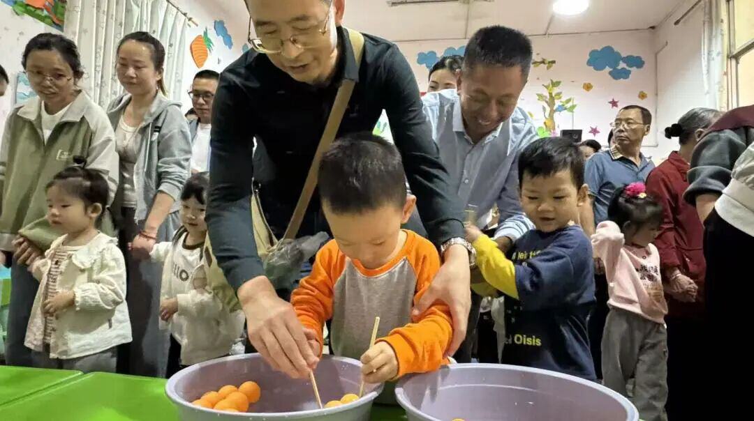 "夹月饼"游戏区,家长和孩子配合默契,用大大的筷子运送着圆圆的"月饼",小心翼翼又充满欢乐。