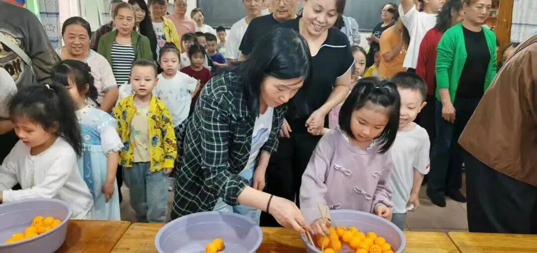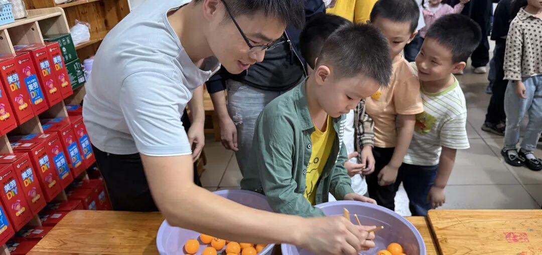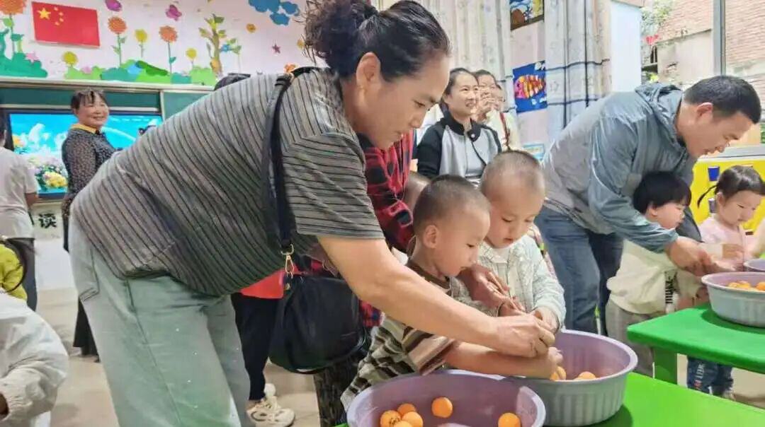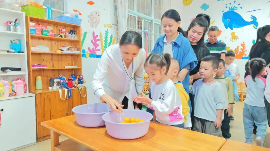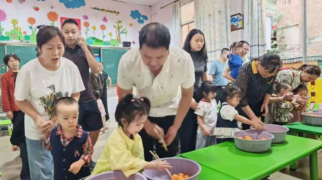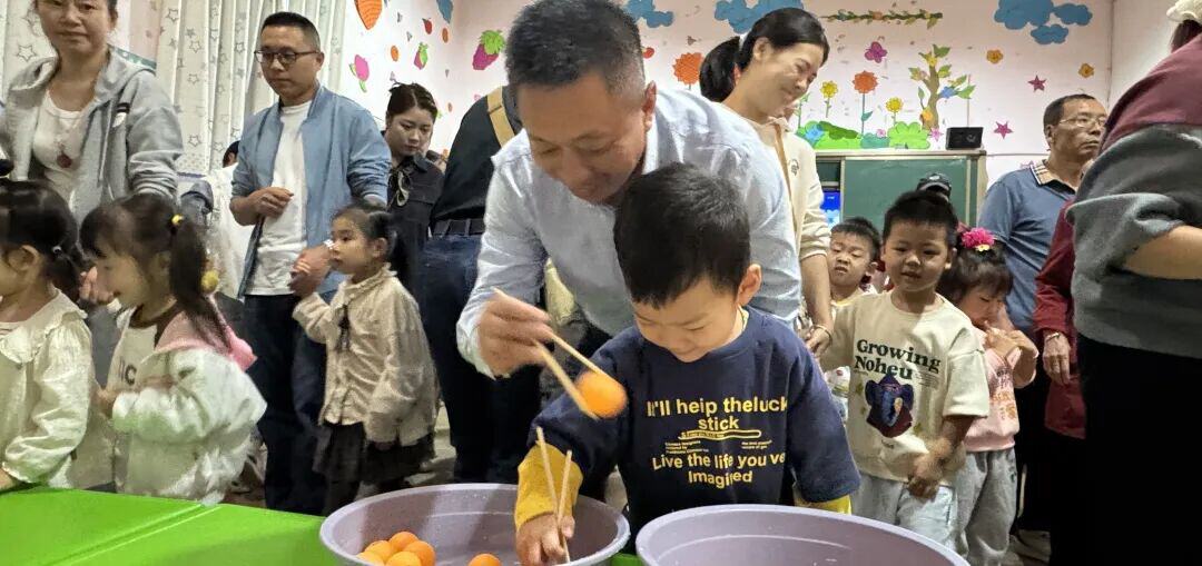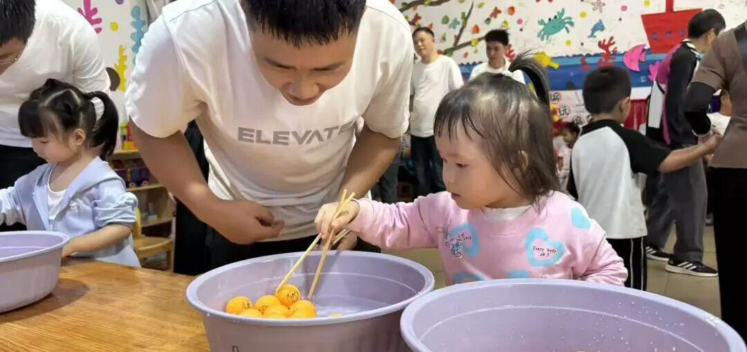 "水中捞月"游戏区,宝贝们拿着筷子,专注地夹起水中漂浮的"月亮",水花溅起,笑声飞扬。