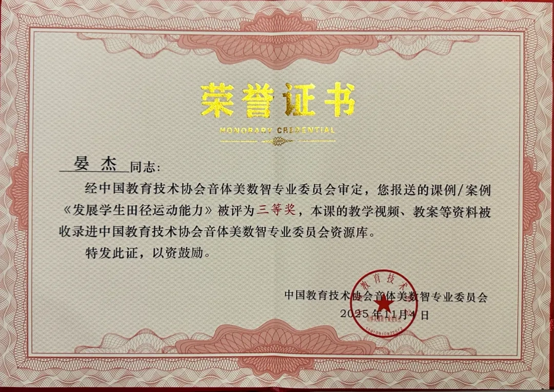 11月4日,六七年级第四次教师大会在合班教室一举行。会议主要有三项议程:一、张林副主任解读《班主任和学科老师项目津贴考核方案(讨论稿)》。杜宇副校长和张林副主任签订《年级半期目标质量责任书》,张林副主任和班主任签订《班级半期目标质量责任书》。三、杜宇副校长讲话,要求老师们统一思想、奋勇争先、明确目标和建立标准。 Part02. 荣誉达嘉 08 晏杰老师课例获全国三等奖 经中国教育技术协会音体美数智专业委员会审定,我校晏杰老师报送的课例《发展学生田径运动能力》被评为全国三等奖,本课的教学视频、教案等资料被收录进中国教育技术协会音体美数智专业委员会资源库。