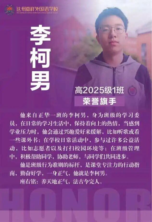 我是来自正华一班的李柯男,以学习委员的身份,在班级中树立起鲜明的成长标杆。我始终怀揣向上的热忱深耕学业,即便面临压力,也能以听歌、品读课外书的方式从容调节,让自律与松弛相得益彰。 在校园的广阔天地里,我的身影活跃于各类公益场景:既是默默奉献的志愿者,也是守护校园洁净的行动者,用点滴善举诠释责任。班级管理中,我更是老师的得力助手、同学的暖心伙伴,主动分享经验、协助解决难题,以协作之力推动集体共同进步。 我是班级行为准则的鲜活范本,是课堂专注投入的生动指南,以勤奋为笔、正气为墨,书写着少年的笃实模样。正如我的座右铭所言:养天地正气,法古今完人。 养天地正气,法古今完人。 恭喜你成为荣誉旗手!你在社区服务中伸出的援手,和今天护旗时挺起的胸膛,都闪耀着责任的光芒。旗在前方,路在脚下,愿你永远心怀热爱向阳生长,愿这抹红,见证你的善良与担当,伴你一路温暖前行。 祝贺你成为荣誉旗手!你在书海中、实验室里探索真理的专注,正是今日守护旗帜所需的品格,挺直的身姿里藏着自律,专注的眼神中透着坚定。愿这抹鲜红,指引你在求知路上永不止步。