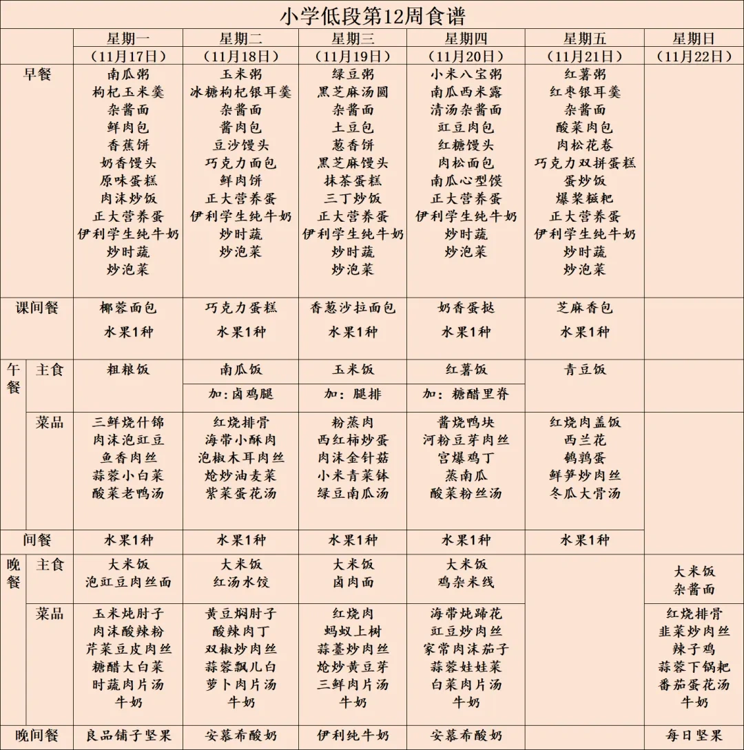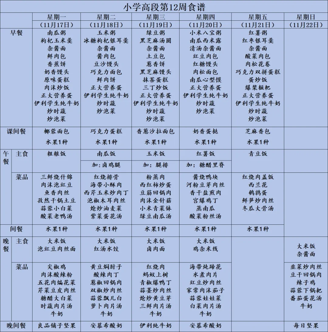 达州嘉祥外国语学校 2025年秋季 第12周食谱 11月17日 ---- 11月22日