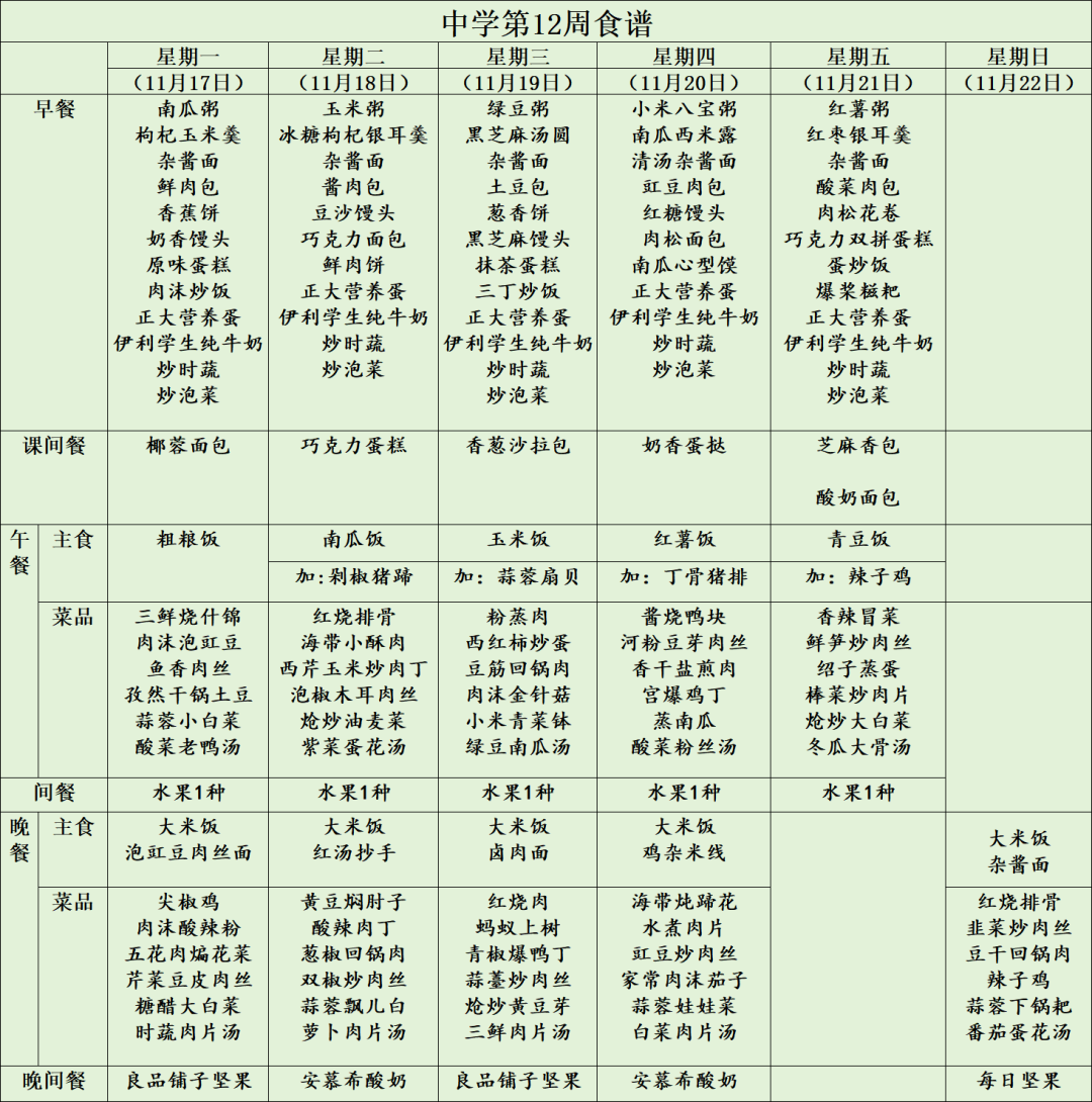 注: 本菜单仅供我校2025年秋季学期第8周(2025年11月17日-2025年11月22日)餐食使用,若遇市场当天原辅料问题,需临时更改或调整,以当日公布的菜品为准。