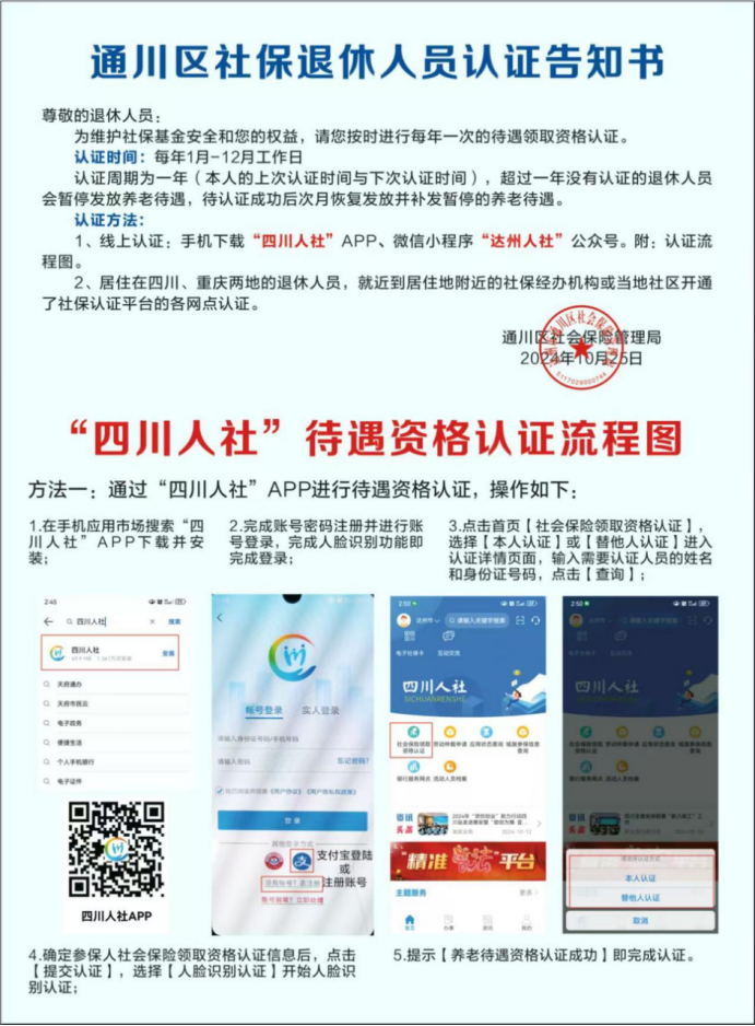1.四川人社app:1.下载四川人社APP;2.完成账号注册;3.登陆并完成人脸识别;4.点击首页社会保险领取资格认证,选择本人认证或替他人认证;5.点击提交认证,选择人脸识别认证开始人脸识别认证;6.页面提示养老待遇资格认证成功。