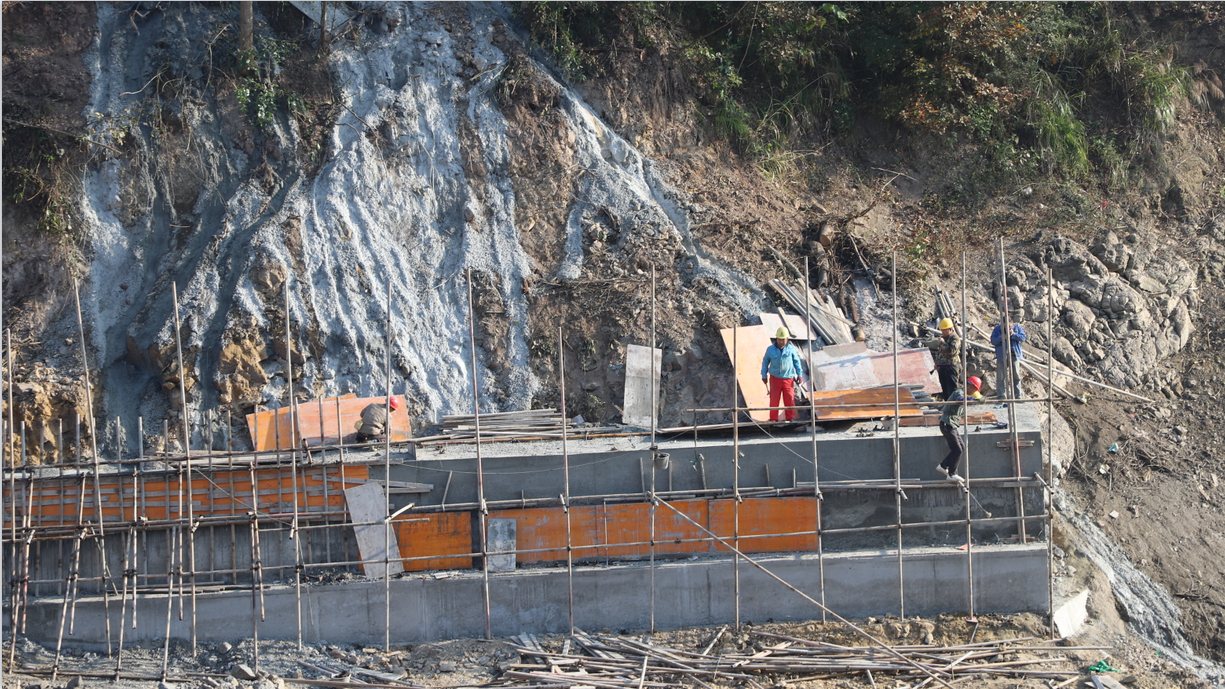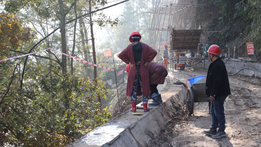 项目施工现场,工人们正在进行水库左岸乡村公路护栏钻孔及水库右岸挡墙关模作业