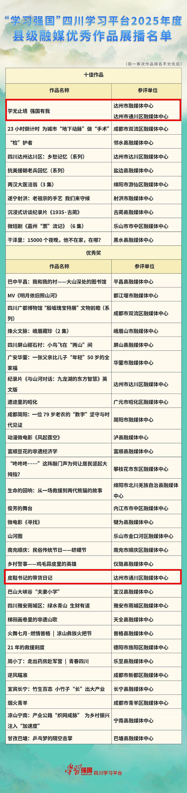 11月28日“学习强国”四川学习平台公布2025年度县级融媒体中心优秀作品,达州市融媒体中心、达州市通川区融媒体中心作品《学无止境 强国有我》及达州市通川区融媒体中心作品《皮鞋书记的带货日记》从全省327件作品中脱颖而出,成功入选 。