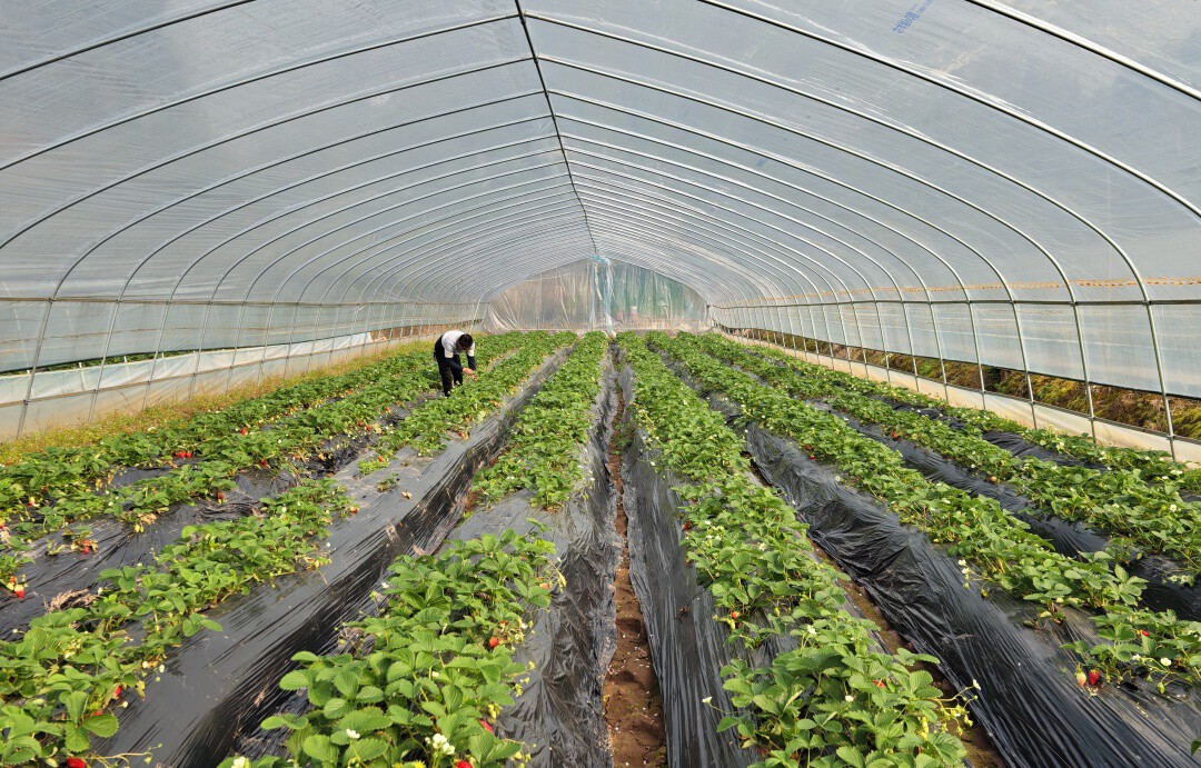 种植户正在观察草莓长势