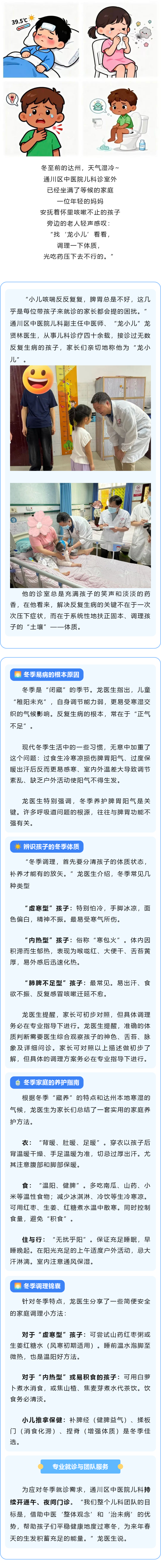 孩子频生病?区中医院“龙小儿”医生为您支招 达州市通川区中医院 2025-12-12 16:53 1497 寒冬孩子频生病?通川区中医院“龙小儿”医生为您支招编辑:伍从燕编审:杨 淋总编:王 勇 打开微信“扫一扫”,打开网页后点击屏幕右上角分享按钮 评论 1 tc38893 2025-12-14 注意健康从我做起 我要评论