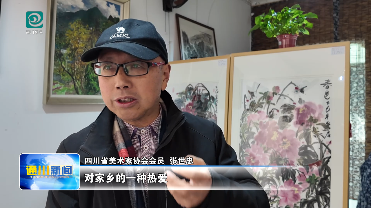 四川省美术家协会会员 张世忠:他的画,画得很有味道,比如说他的牡丹,还有这些山水、人物,这是他早期的一种作品。现在的画一看,画的我们家乡,就更加豪放一些,在豪放之余就感受到,我们对家乡的一种美,对家乡的一种热爱。