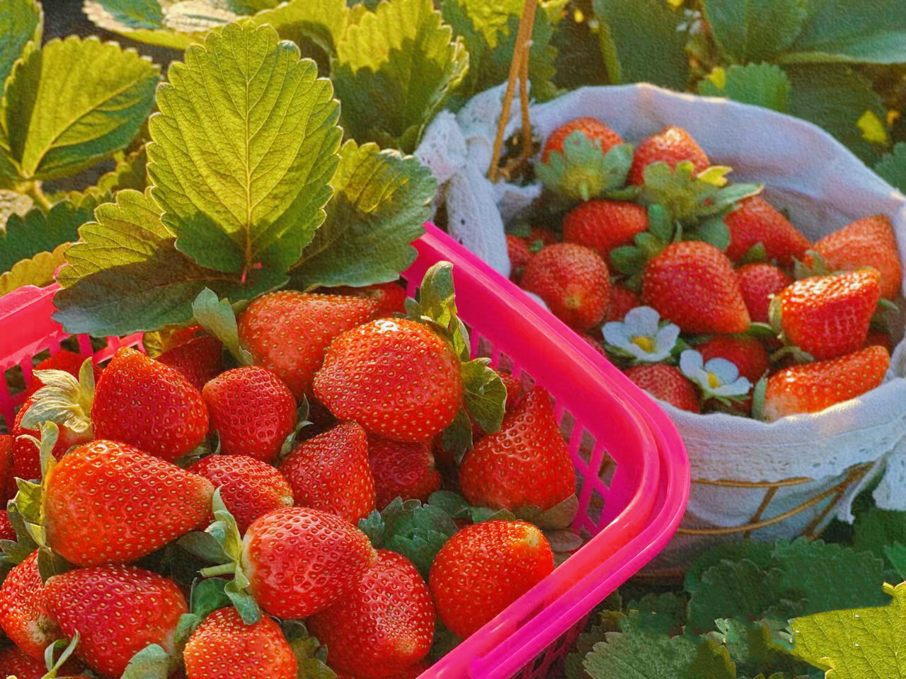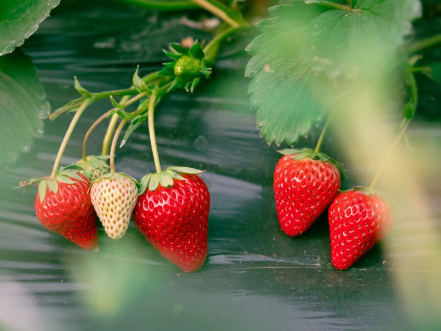 一颗颗饱满红润的草莓就藏在绿叶之下