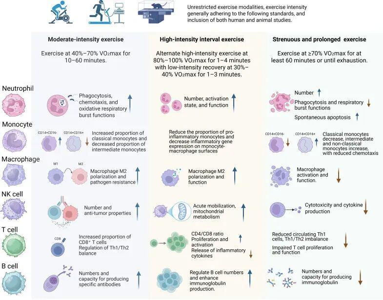 在以运动负荷为核心的综述中,研究者明确区分了“强度”和“总量”这两个概念:在推荐范围内的高强度间歇训练,并不会破坏免疫稳态;但当高强度训练持续时间延长、频率增加、恢复不足时,多类免疫细胞在外周血中的数量和功能下降,可持续 3 到 72 小时。
