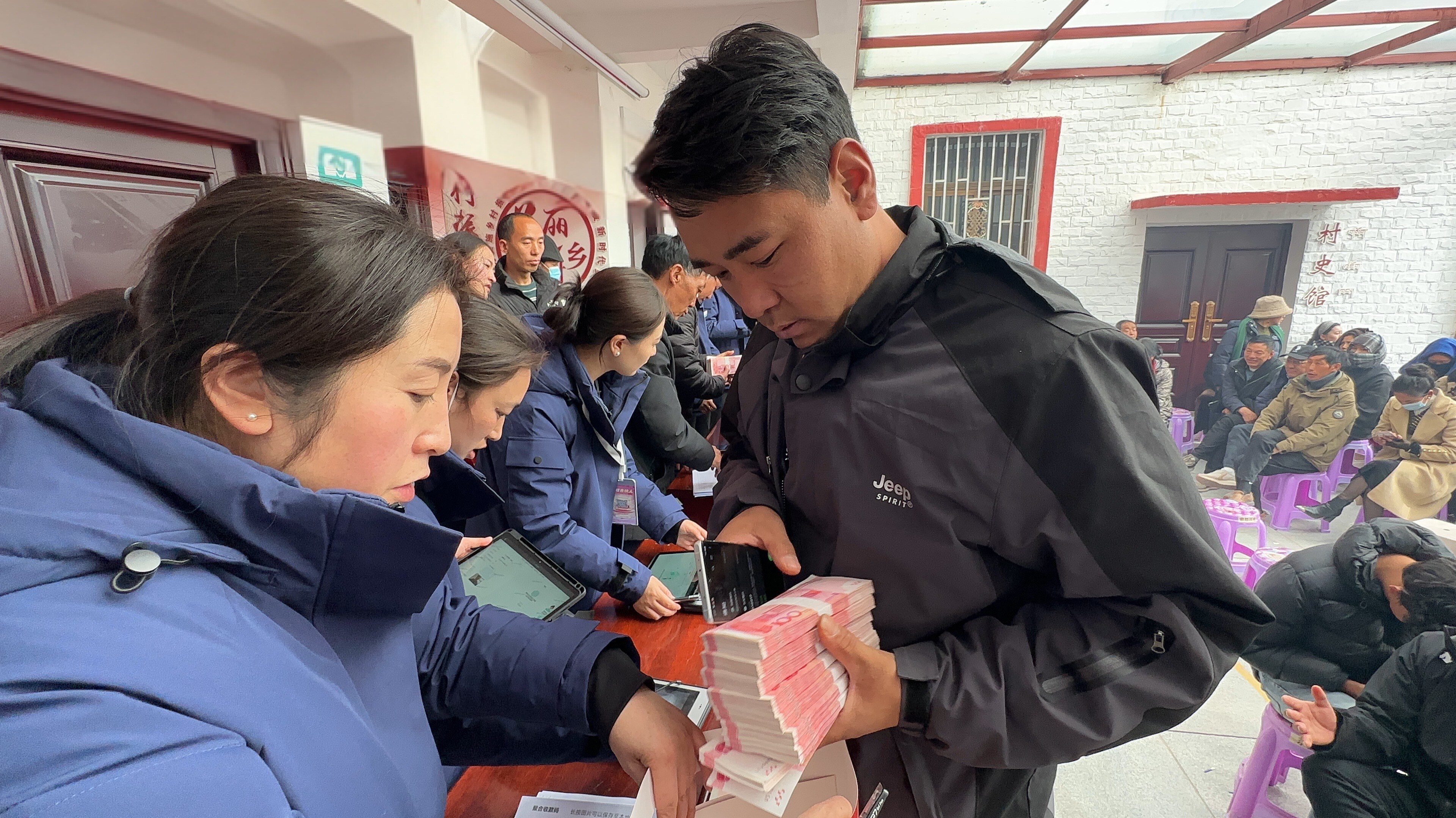 现场村民有序核对信息、签字按手印领取现金,点钞声与欢笑声交织,大家纷纷盘算将分红用于置办年货、预留教育费用、投入家庭经营。