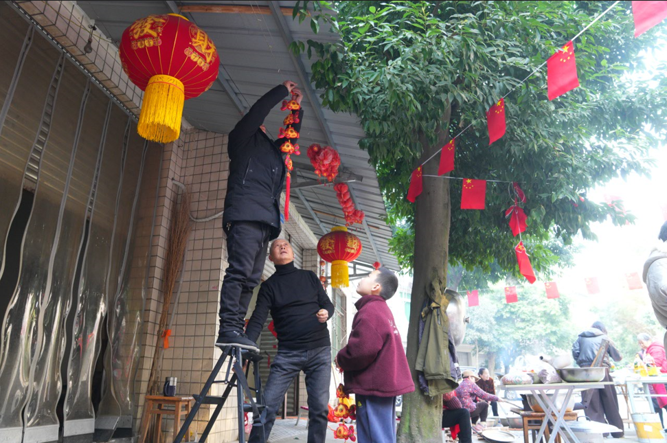 在蒸腾的烟火气之外,邻里们还自发张罗起节日氛围的营造——挂灯笼、贴福字,将团圆的仪式感细细织入街巷的细微角落。