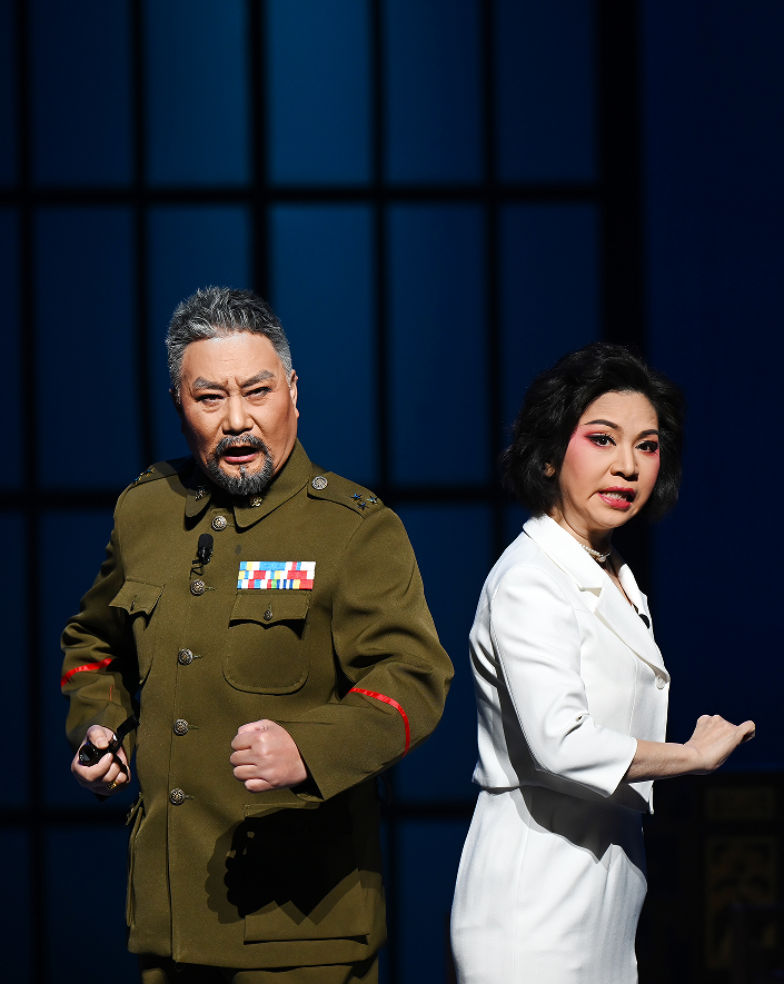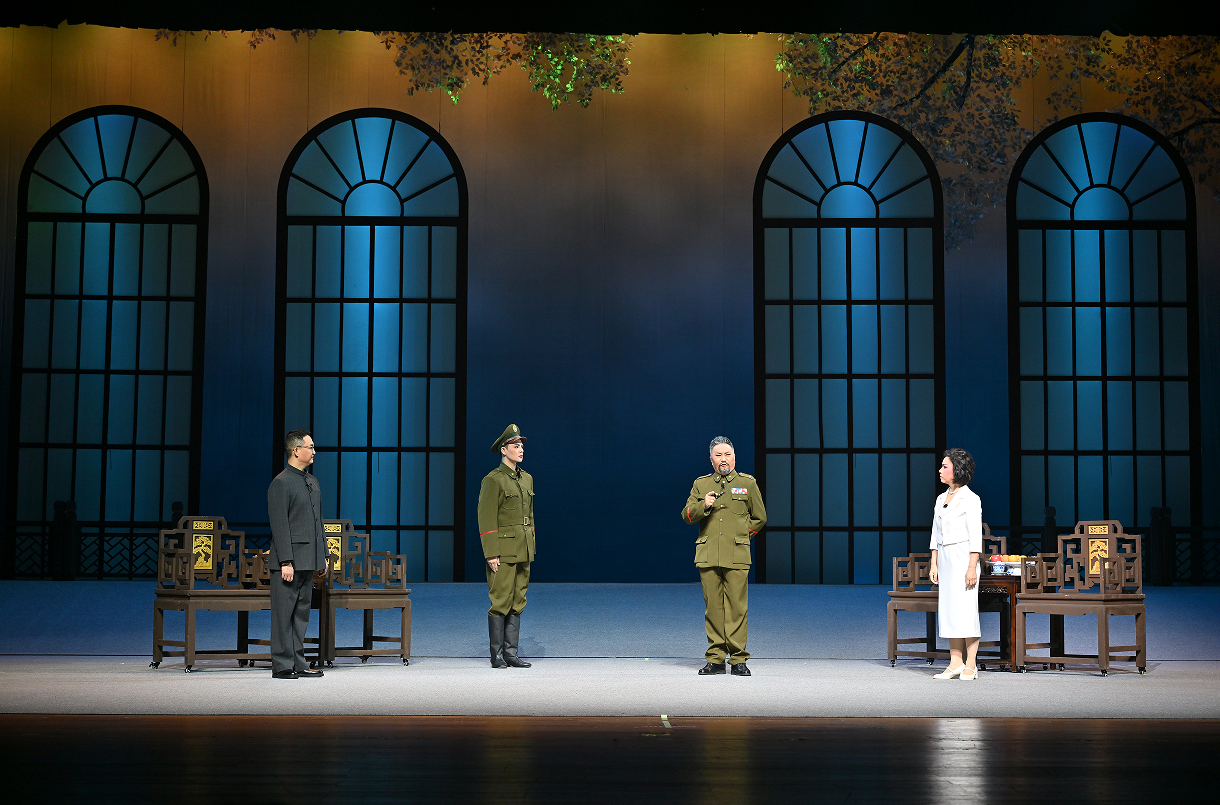 这种张力,在剧中极具代表性的“四方对质”场景中体现得尤为充分。舞台以一束主光勾勒出冰冷方形,场景极简凝练。杨汉秀、杨森、副官杨兴、秘书赵益民四人各据一角,立于定点光中。杨兴一见杨汉秀,暗自揣测“这个女人不一般”;杨汉秀察觉到了“杨兴心里有算盘”;赵益民作为杨汉秀的联络人,思忖“定要想法去化解”;而杨森则处事圆滑,打算“留一手,我想两边攀”。
