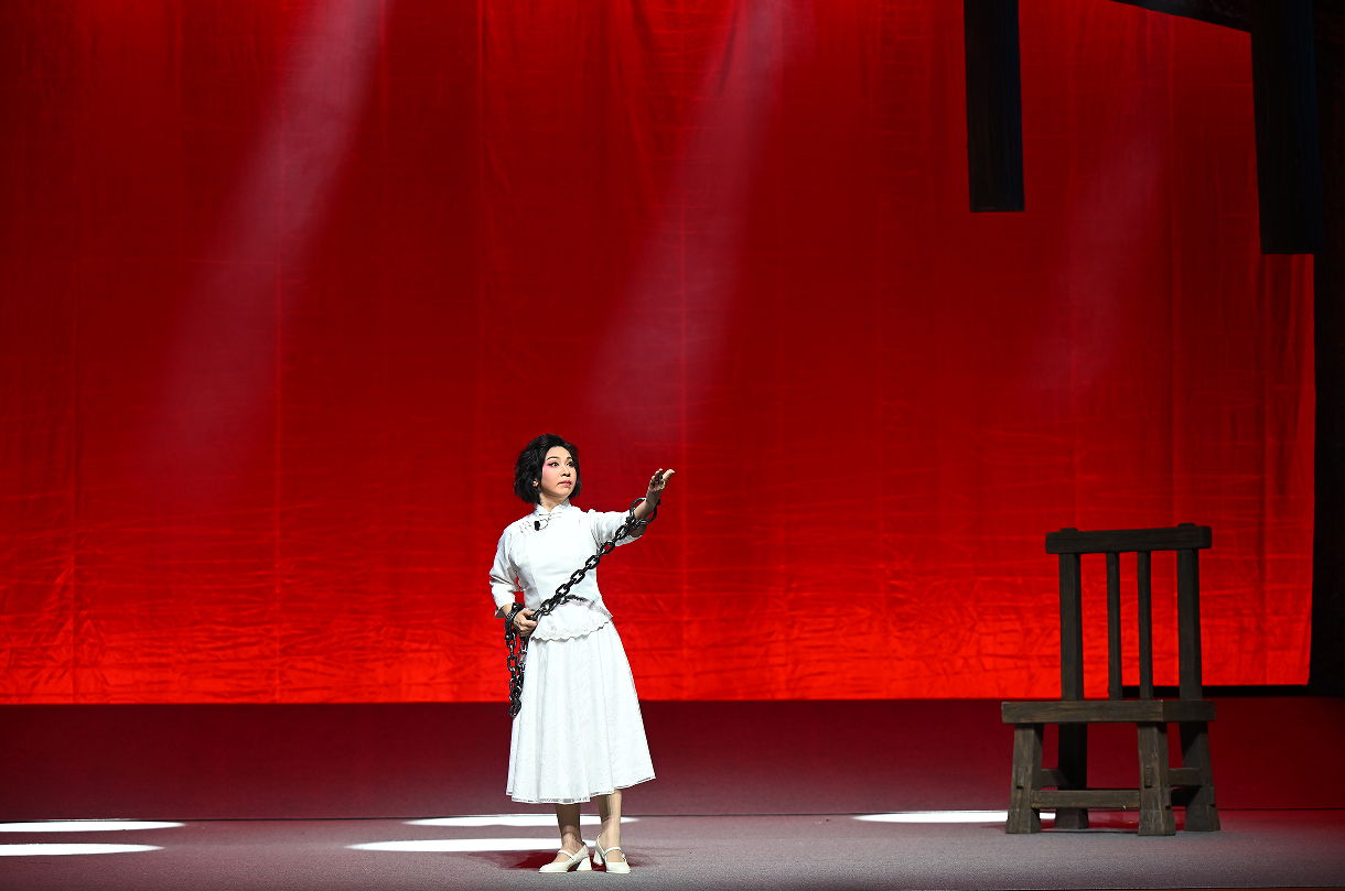 剧场灯光渐亮,舞台中央悬挂的硕大镣铐赫然醒目,与开场山歌“看你连天黑多久,总有太阳钻出来”形成强烈对比,瞬间将观众带入白色恐怖的峥嵘岁月。剧终时分,杨汉秀在漫天赤红中慷慨就义,熟悉的山歌再度响起,完成从黑暗到光明、从绝望到希望的艺术轮回。