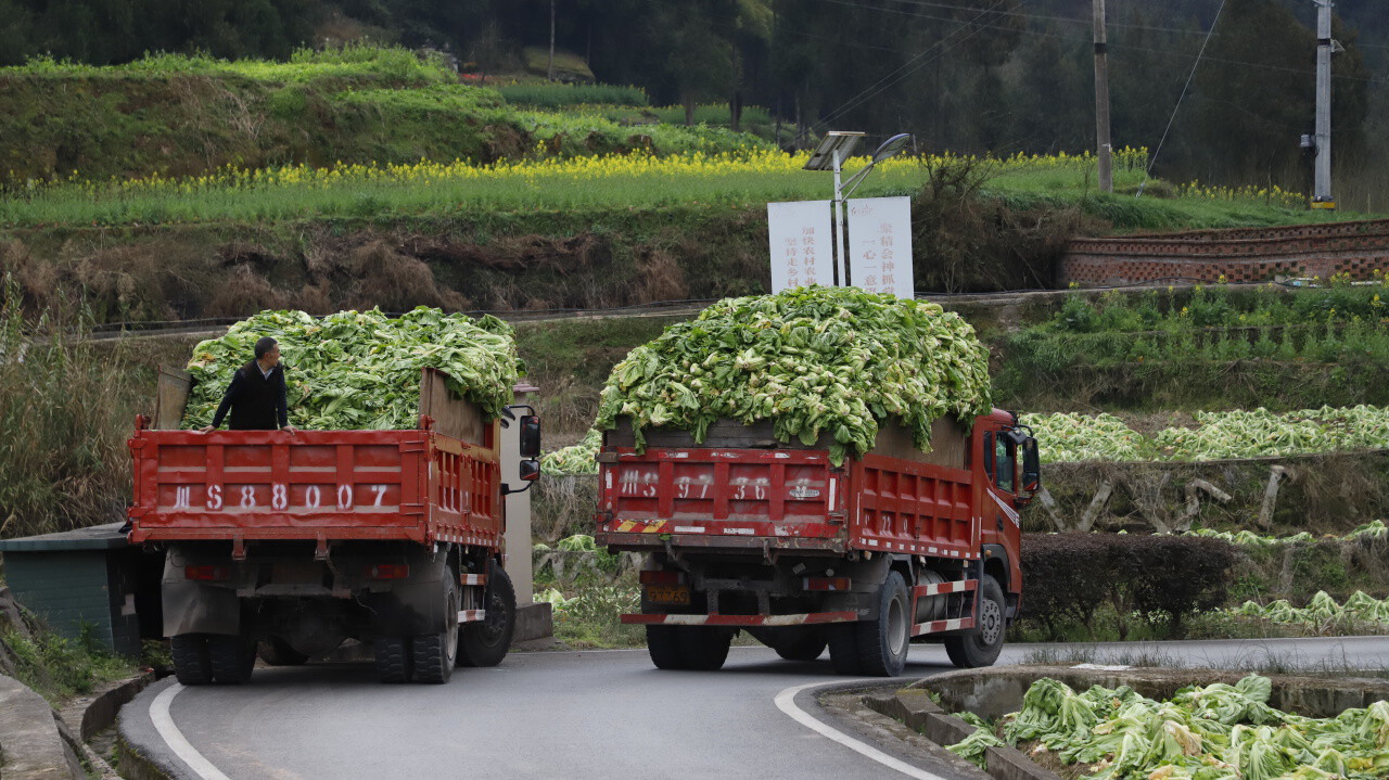 在宝泉村“黑糯玉米+青菜”轮作种植基地,农户们穿梭往来,采收、分拣、装车等工序一气呵成,一辆辆满载新鲜青菜的货车依次驶出基地。带着泥土清香的青菜,刚从田间采收完毕,便直接运往合作企业,成为村民家门口的“致富菜”。