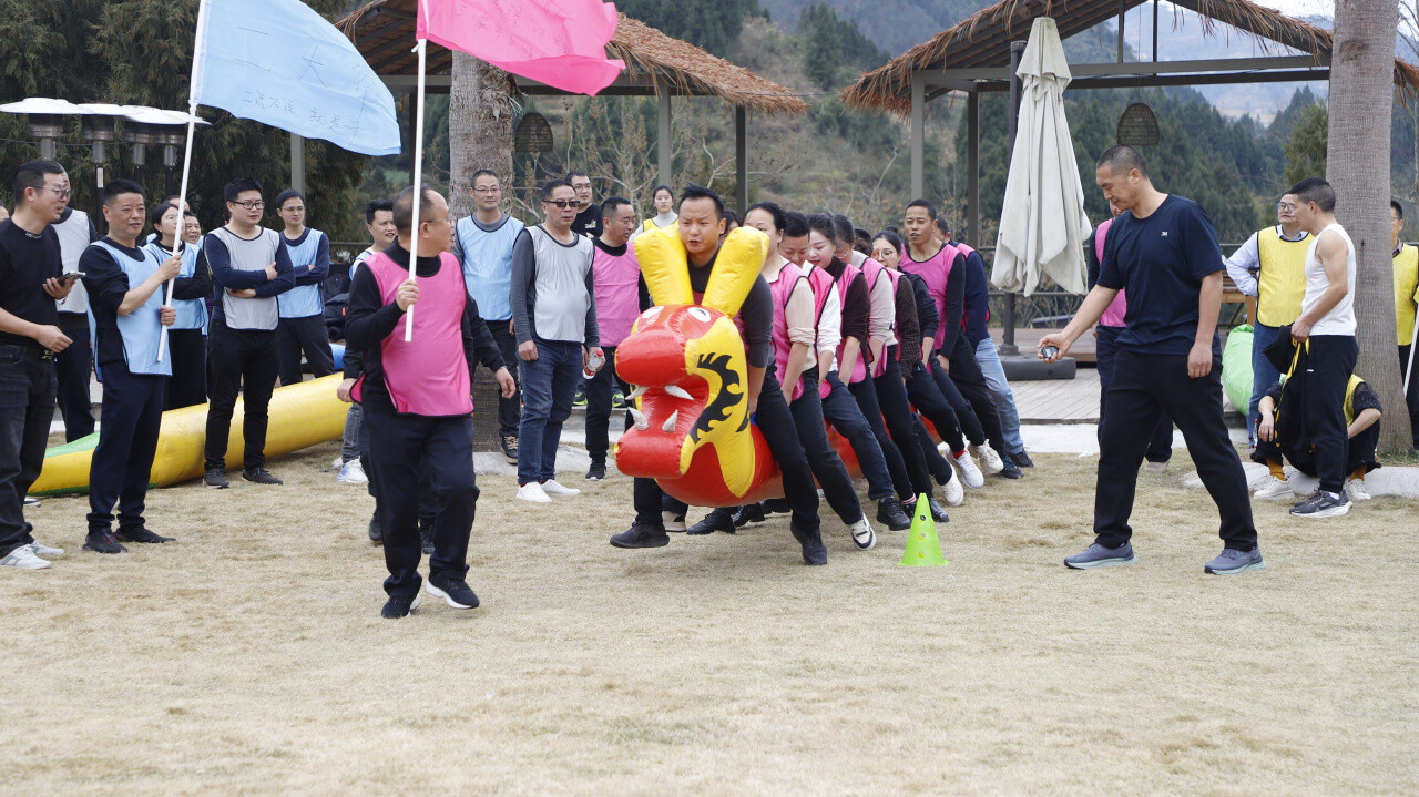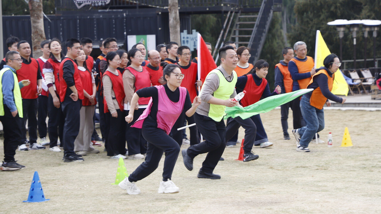参观结束后,趣味运动会正式拉开帷幕。活动现场,8支参赛队伍精神饱满,在“旱地龙舟”“鼓点金穗”、接力赛、跳绳等项目中展开角逐。队员们默契配合、奋勇争先,加油声与欢笑声此起彼伏,现场气氛热烈。“活动既有学习又有互动,大家互帮互助,既缓解了压力,也增强了团队归属感,今后工作中我们也会更团结、更有干劲。” 区农业农村局办公室主任王伶俐笑着说道。