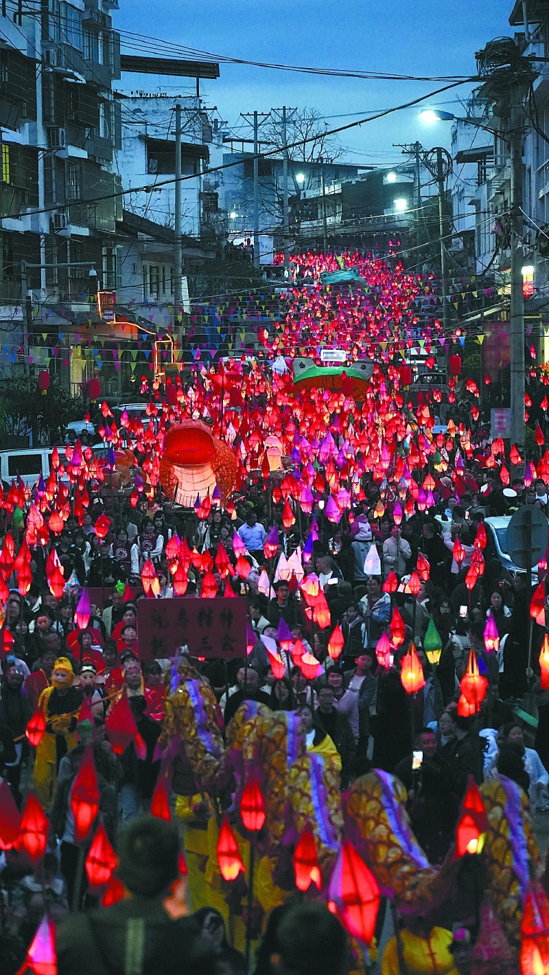 各地的主要街道上,由当地群众和游客组成的巡游队伍集结在一起。其中,最引人注目的是打头阵的巨型蛴蟆灯。这些巨型蛴蟆灯高过人头,需要数人才能将其抬起,在夜色中格外醒目。人群手持着造型各异的小蛴蟆灯紧随其后,排成长龙。