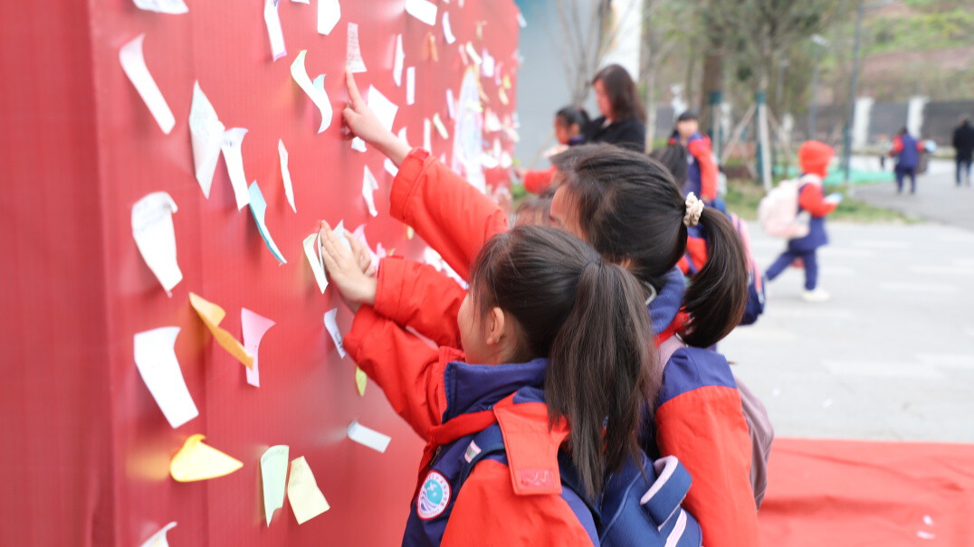 清晨的校园焕然一新,处处洋溢着春日的朝气。校门口、教学楼走廊、主席台等位置悬挂着醒目的主题标语,气球拱门、许愿墙、主题KT板点缀其间,将整个校园装点得生机盎然。上午8时许,心愿墙前已排起长队,同学们手持写满新学期愿望的心愿卡,认真贴于墙上。一笔一画,承载着童真的期许,也寄托着对未来的美好向往。