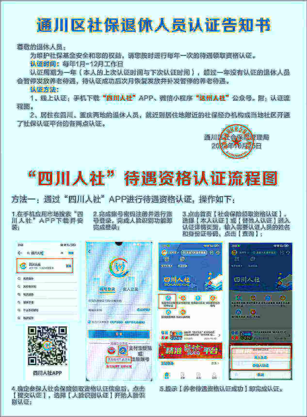 1.四川人社app:1.下载四川人社APP;2.完成账号注册;3.登陆并完成人脸识别;4.点击首页社会保险领取资格认证,选择本人认证或替他人认证;5.点击提交认证,选择人脸识别认证开始人脸识别认证;6.页面提示养老待遇资格认证成功。