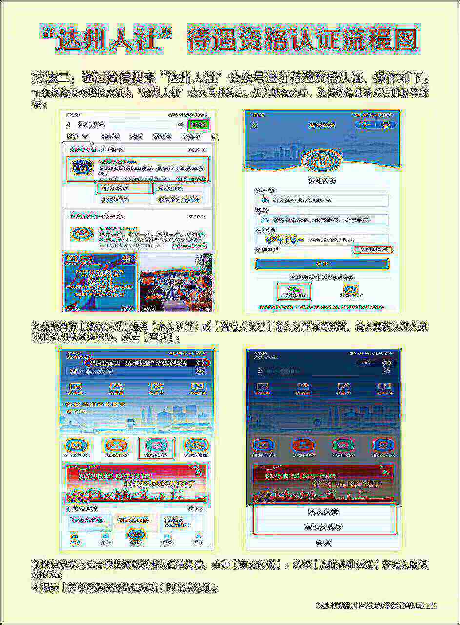 2.微信小程序“达州人社”:1.关注达州人社公众号;2.点击首页资格认证;3.选择本人认证或替他人认证;4.点击提交认证,选择人脸识别认证开始人脸识别认证;5.页面提示养老待遇资格认证成功。