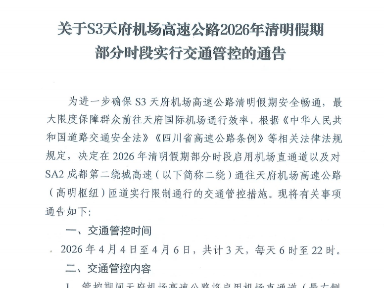 清明假期出行请注意!天府机场高速将启用机场直通道