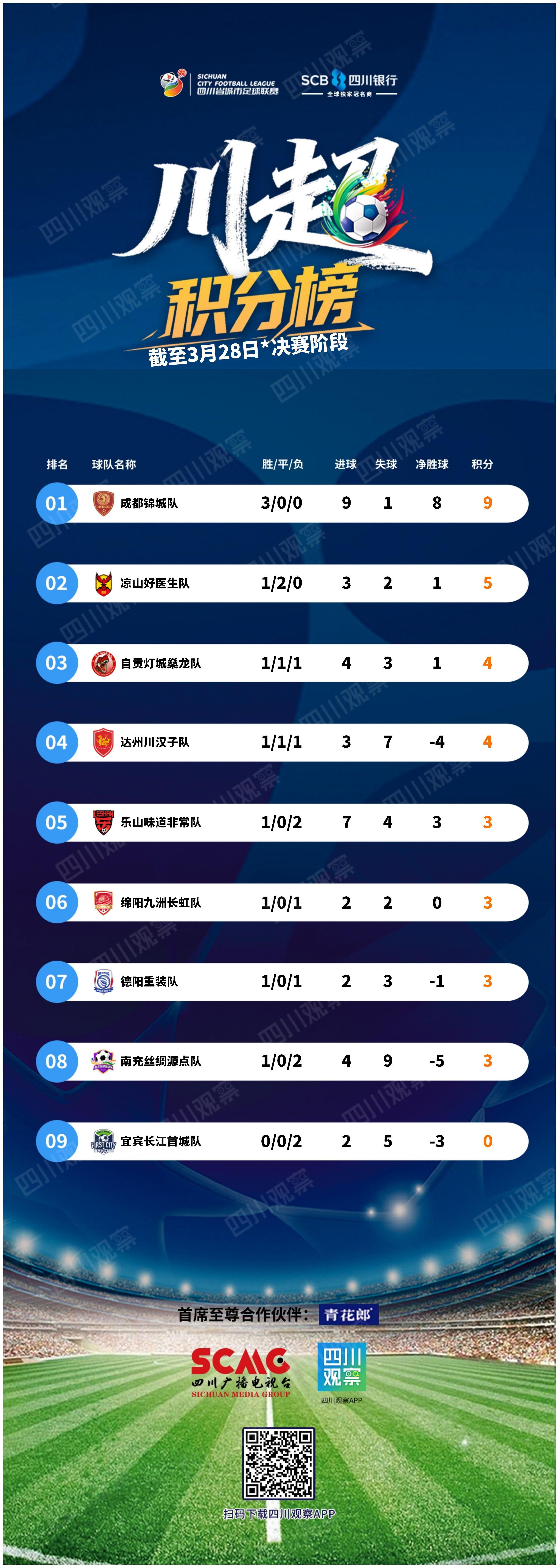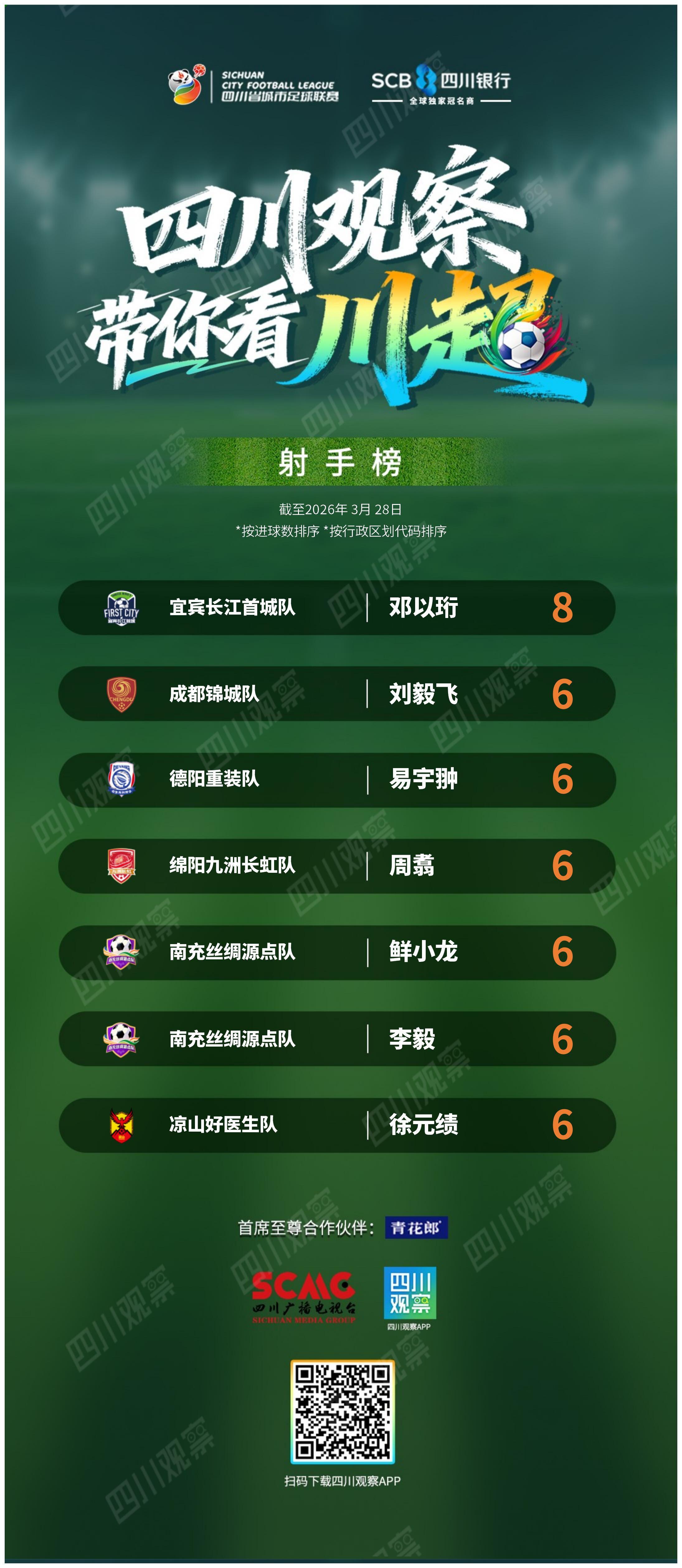 截至3月28日决赛阶段第三轮结束,“川超”最新积分榜与射手榜如下: