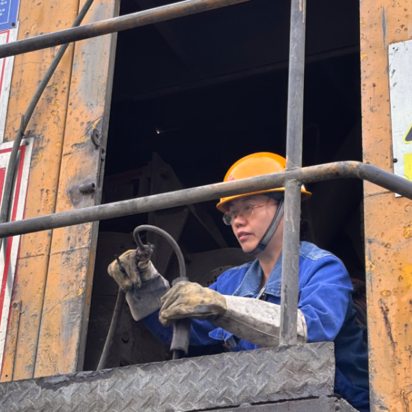 她日常需要焊水箱、换拉门绳、修铲斗、焊断裂的大梁。有时候蜷缩在狭窄的铲斗内腔,也曾攀上十几米高的检修架。仰焊、俯焊、跪焊,每个姿势要维持很久。活儿不多的时候,中午12点从采石场下撤回厂房,午餐、休息。忙起来要在采石场吃午饭——“有时候一阵风吹来,沙子就吹进盒饭里。”下午继续上采石场维修采矿机,或是在厂房焊铁板,5点打卡下班。这样的工作节奏,循环往复了28年。