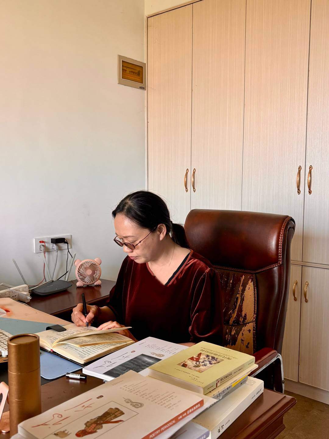伍尔夫说,女人要写作需要一间单独的房间。温馨的家在攀枝花东华山脚下,室内装修由她一手设计,焊接的部分也亲自动手。她特意给自己安置了一个书房,面积不大,但光明洁净,视野开阔,站在窗前能望见大片的东华山。窗户外头是她家种的枇杷、樱桃、葡萄,还有各种菜,“吃都吃不完。”她在这里看书、写作、练古筝。书架上的书不多,都是文学书籍,诗歌占了大半。这个从矿山走出来的女人,在属于自己的光亮里,安放她的诗句。