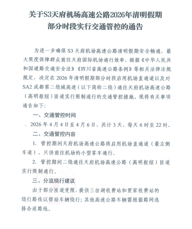 4月1日记者从四川高速公安一分局获悉,2026年清明假期(4月4日至4月6日)每天早6点到晚10点,S3天府机场高速公路将启用机场直通道(最左侧车道),SA2成都第二绕城高速(以下简称:二绕)通往天府机场高速公路(高明枢纽)匝道将限制通行。