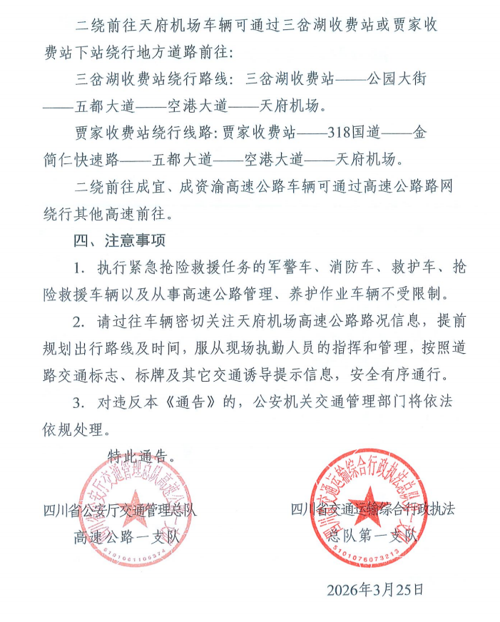交管部门提示,机场直通道只供前往机场的小型客车通行,由于部分匝道受限,提供三岔湖收费站和贾家收费站的绕行路线以帮助车辆绕行,其他高速公路车辆需根据路网选择合适路线。