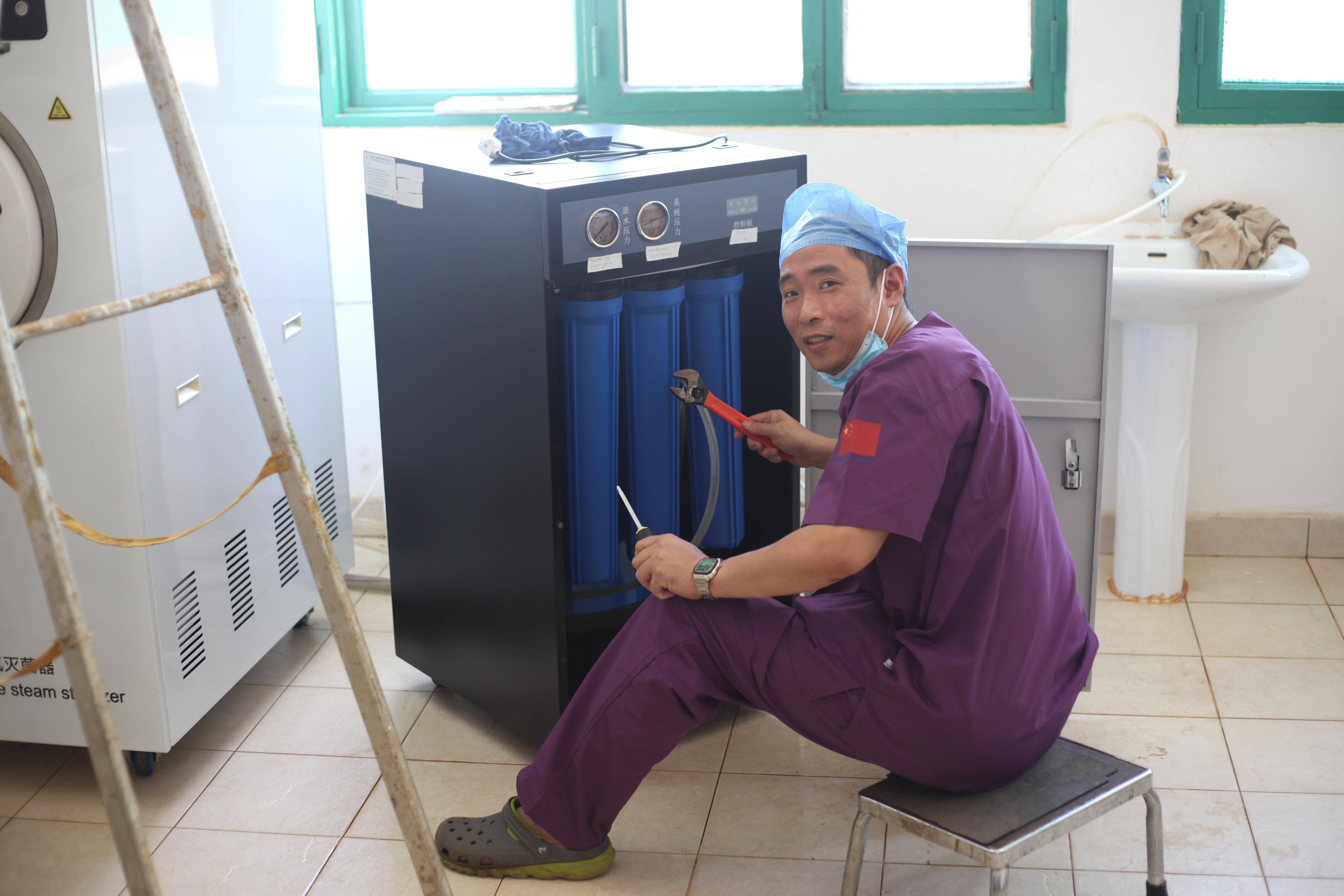 作为驻卡松果援助点的“点长”,吴舒懋没有等。他带着队员们一次次拜访当地卫生部门,自己撸起袖子和院方水电工一起维修管线、修理机器。渐渐地,水通了,电来了。