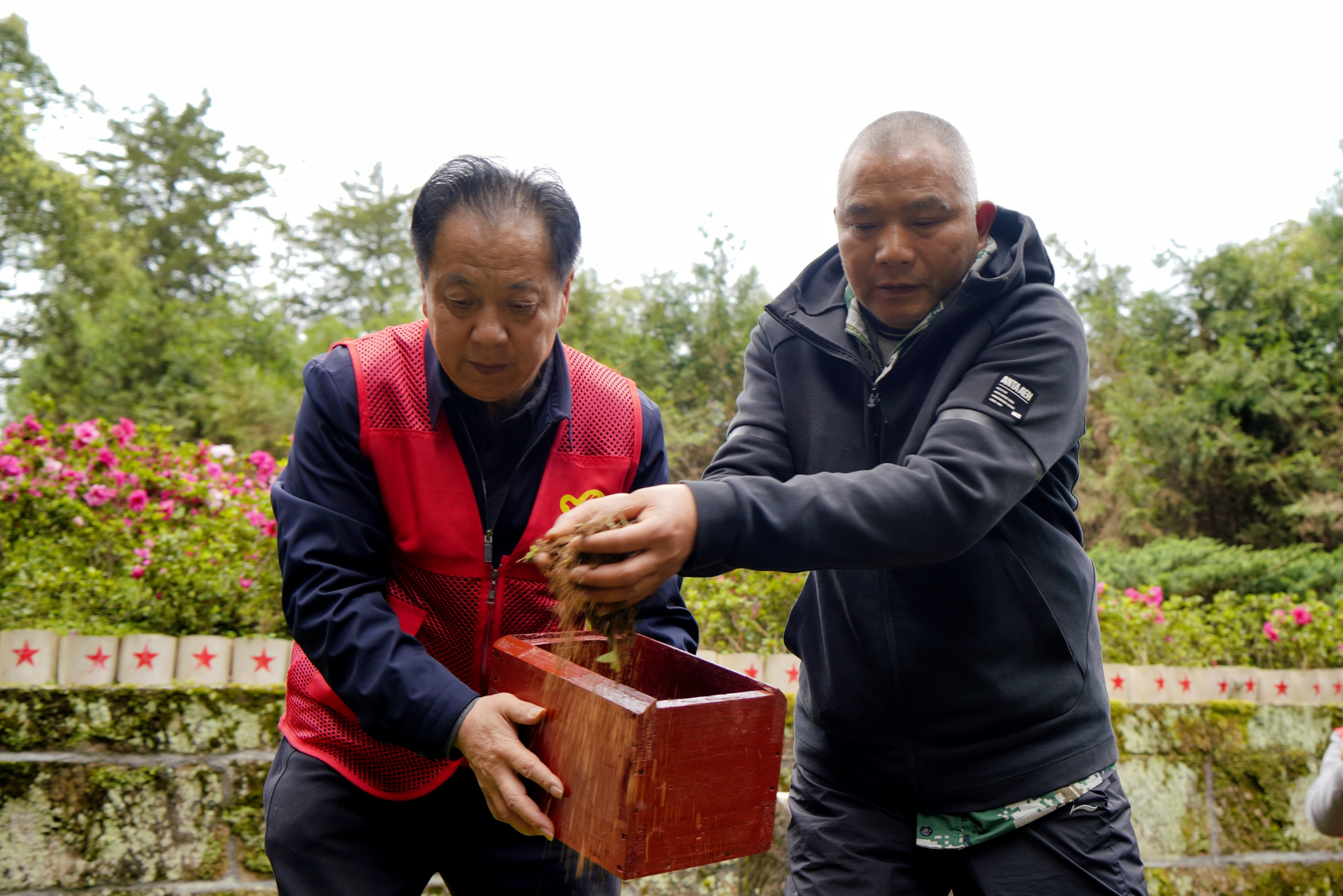 “二伯,我们来看您了!找了八十多年,终于找到您了!”按照老家的习俗,张克争在志愿者的协助下,将从红安老家带来的花生、红薯、特色糕点一一摆放在墓碑前,斟上满满一杯家乡的白酒,再小心翼翼地将随身携带的故土撒在墓前。随后,他躬下身子,用铲子轻轻铲起墓地上的泥土,郑重地装进红木盒子,再用鲜红的绸缎细细包裹,仿佛捧着一件稀世珍宝。“二伯,我们带您回家了。”这声哽咽的呼唤,穿越时空,既是对英烈的告慰,也是对家族心愿的了却。周围的志愿者、工作人员无不动容,默默擦拭着眼角的泪水。
