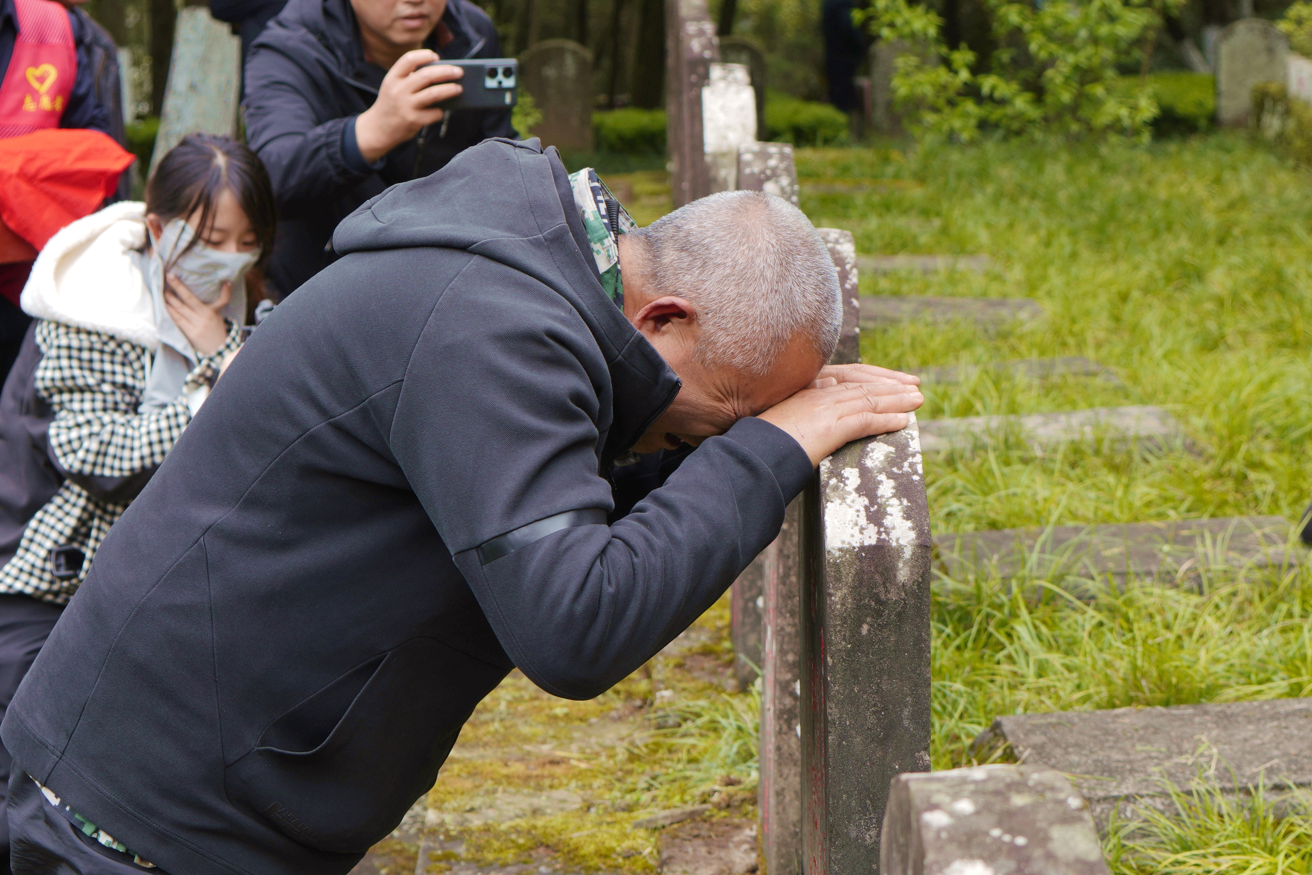 上午9时许,烈士亲属代表手持鲜花,神情肃穆地走向烈士墓碑。当张泽艳烈士的侄子张克争在墓碑上看到“张泽艳,湖北红安人,红四方面军第四军三十团政委,1933年9月牺牲于巴州(中)”的字样时,积压多年的情感瞬间爆发。他颤抖着双手轻抚墓碑、鞠躬献花,泪水无声滑落。