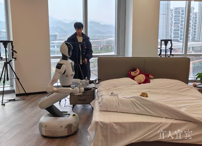 位于宜宾市高铁南片区的西南具身智能训练中心,机器人正在学习叠被子 黄平 摄