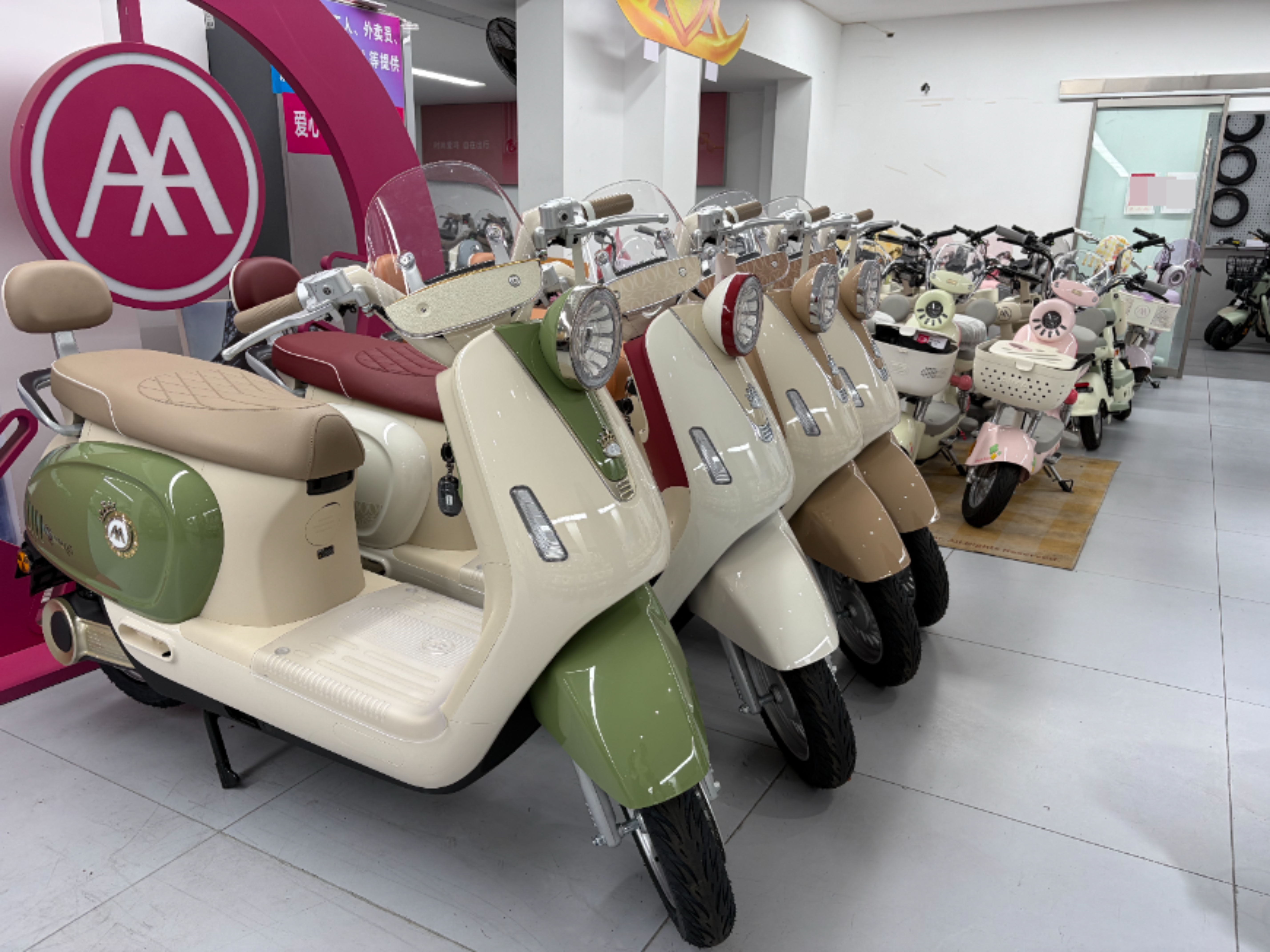 爱玛电动两轮车门店内陈列的电动两轮车。
